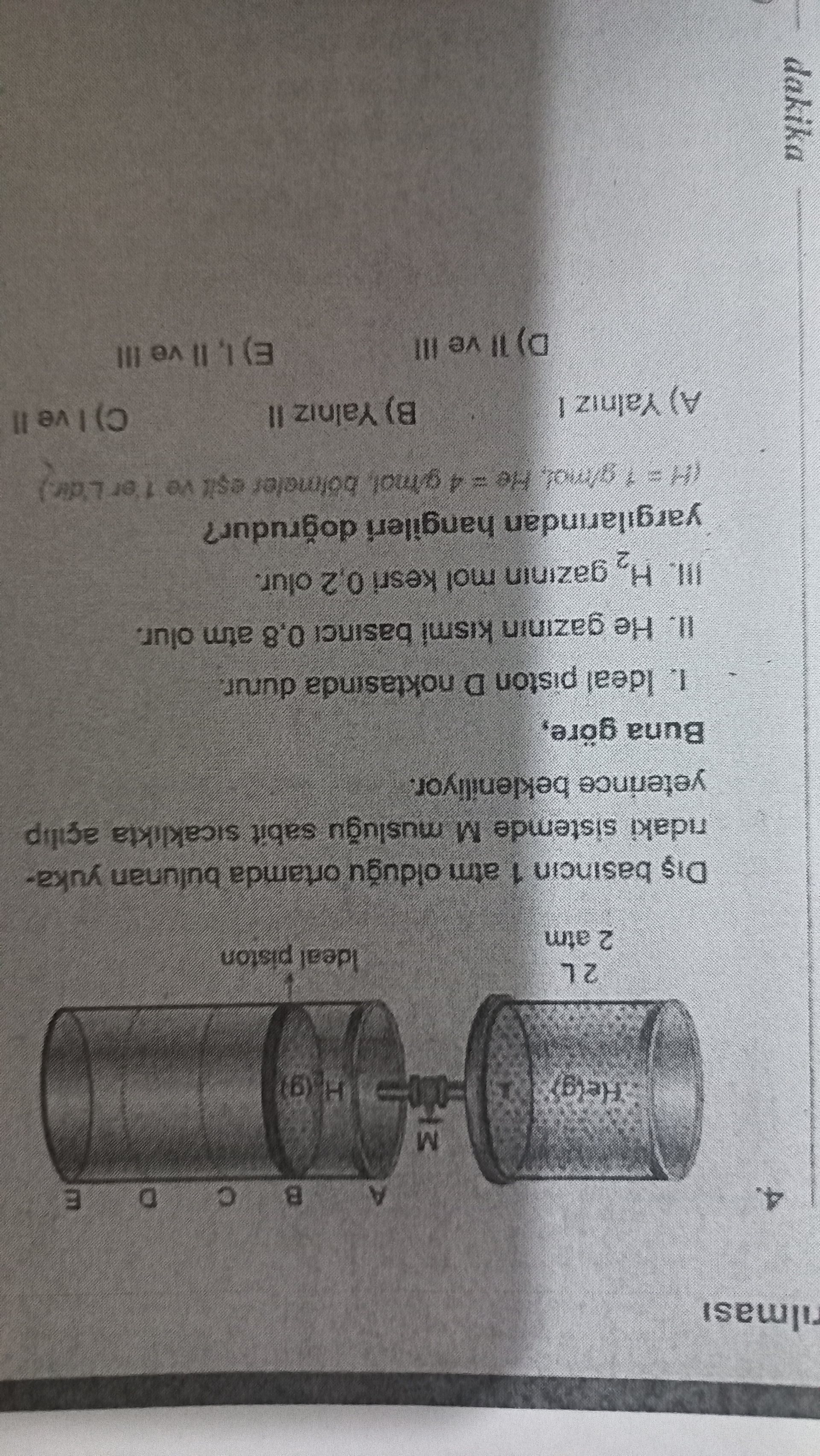 Doğru şıkkı bulabilmem için sorudaki metni tam okuyamıyorum; fotoğraf hem yan duruyor hem de çözünürlük düşük, yazılar bulanık kalmış. Görselde piston, yay ve sürtünmesiz yatay düzenek var ama ifadeleri seçemediğim için hangi önermelerin verildiğini net göremiyorum.