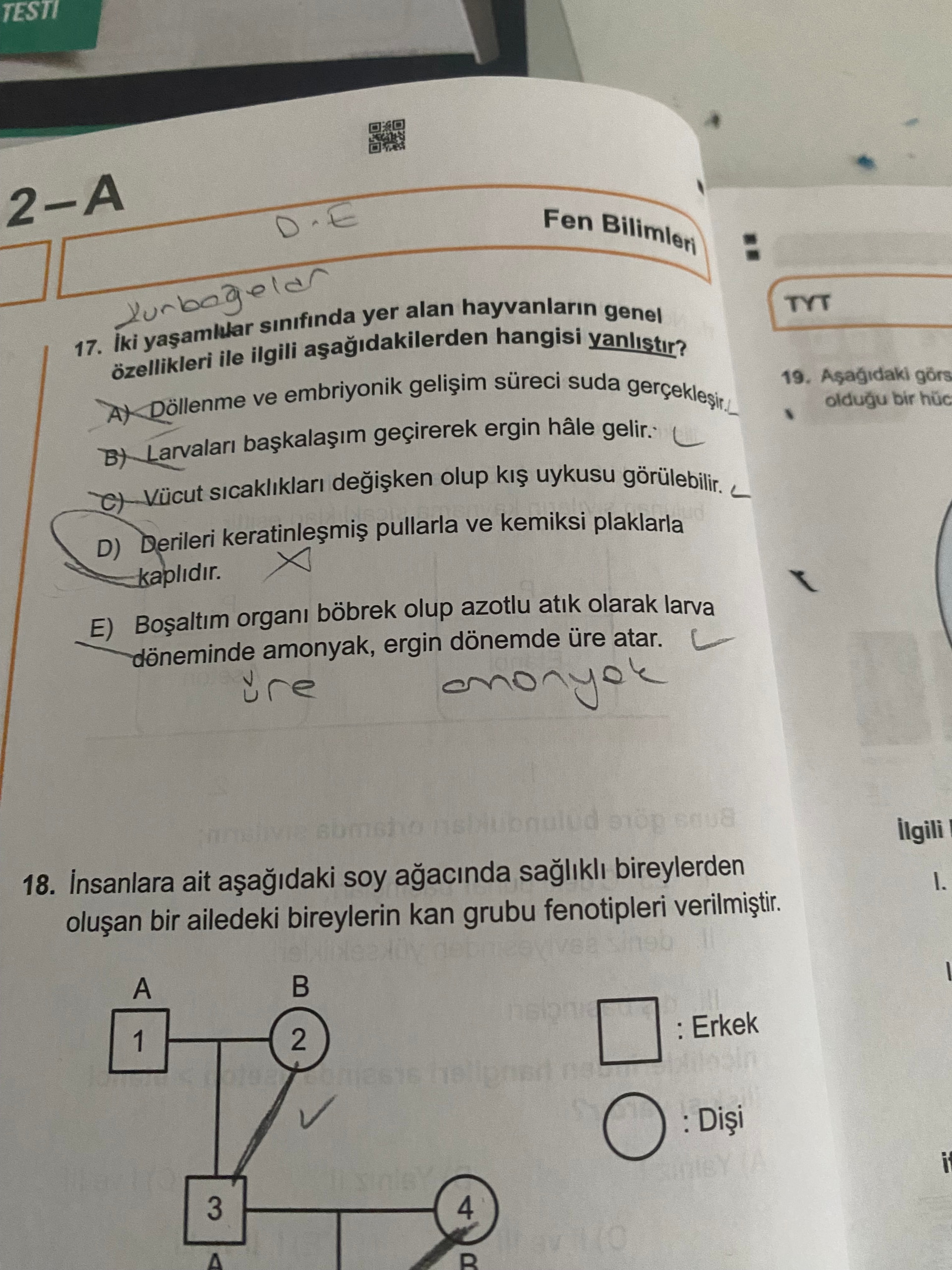 Genel açıklama: Görsel bir Fen Bilimleri test sayfası; iki yaşamlıların (amfibiler) özellikleriyle ilgili çoktan seçmeli bir soru ve ABO kan grubu fenotiplerini içeren bir soy ağacı sorusu ile birlikte bazı el yazısı notları içeriyor.