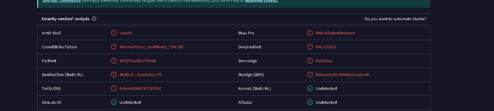 Summary: The image shows a “Security vendors’ analysis” table listing detection results from multiple vendors. Most vendors flag the item as malicious or unsafe, while a few (AhnLab‑V3, Acronis (Static ML), Alibaba) report Undetected; there’s also a banner inviting users to join the community and a prompt asking about automating checks.
