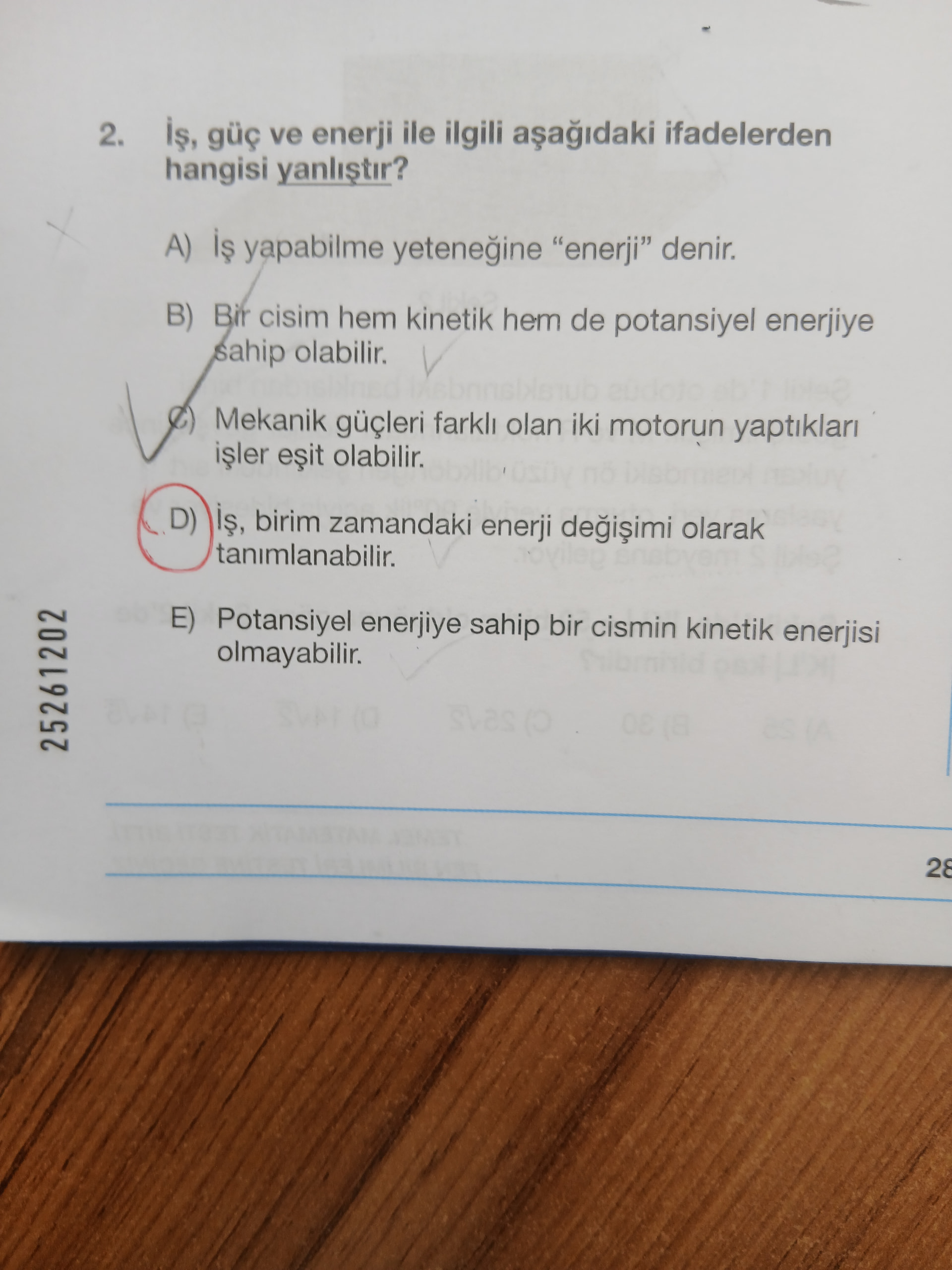 - D şıkkı işin tanımını yanlış veriyor. İş, fiziksel olarak bir kuvvetin bir cismin üzerinde yol aldırmasıyla yapılan enerjinin transferidir ve genelde W ile gösterilir. Güç ise birim zamanda yapılan iş veya birim zamanda enerji değişimidir ve P ile gösterilir.