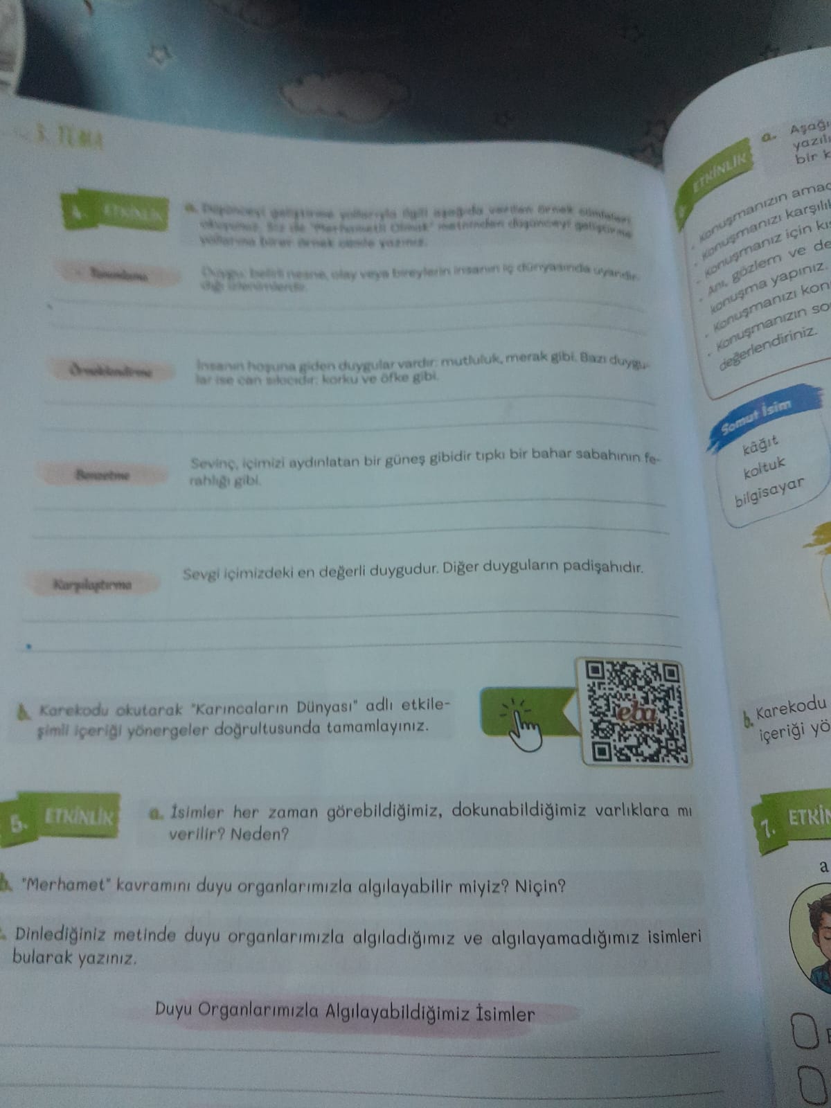 Gördüğüm kadarıyla sayfada “Merhamet” ve duyular (duyu organlarıyla algılayabildiğimiz / algılayamadığımız isimler) ile ilgili sorular var. Net olmayan kısımları tahmin ederek dolduracağım; sen kitabındaki tam cümleyle karşılaştırıp ufak düzeltme yapabilirsin.