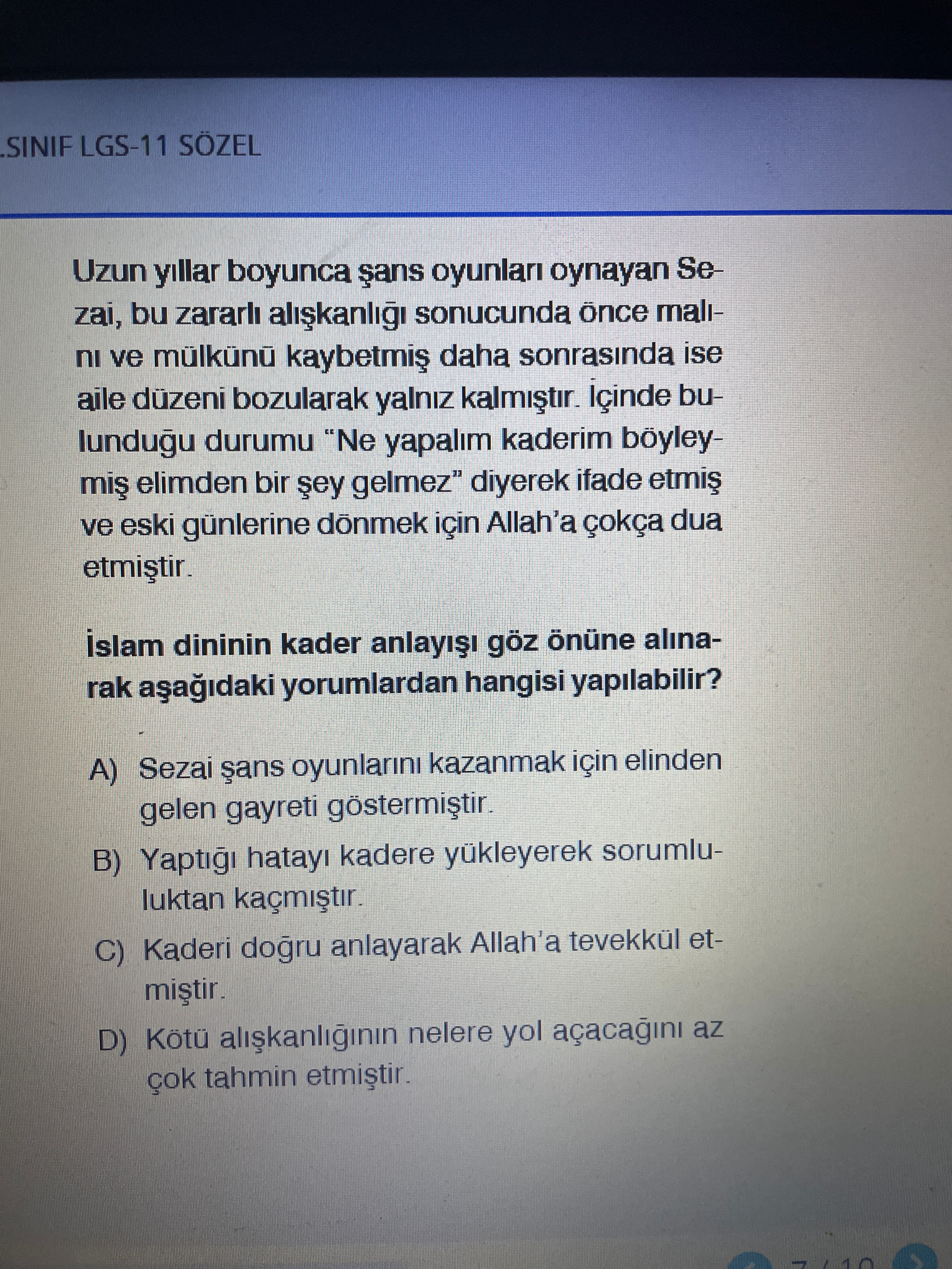 Bu görsel, LGS düzeyinde din kültürü ve ahlak bilgisi alanından bir çoktan seçmeli soru içermekte; şans oyunları alışkanlığı olan bir kişinin durumundan hareketle İslam’da kader anlayışına göre doğru yorumun hangisi olduğunu sorgulamaktadır.