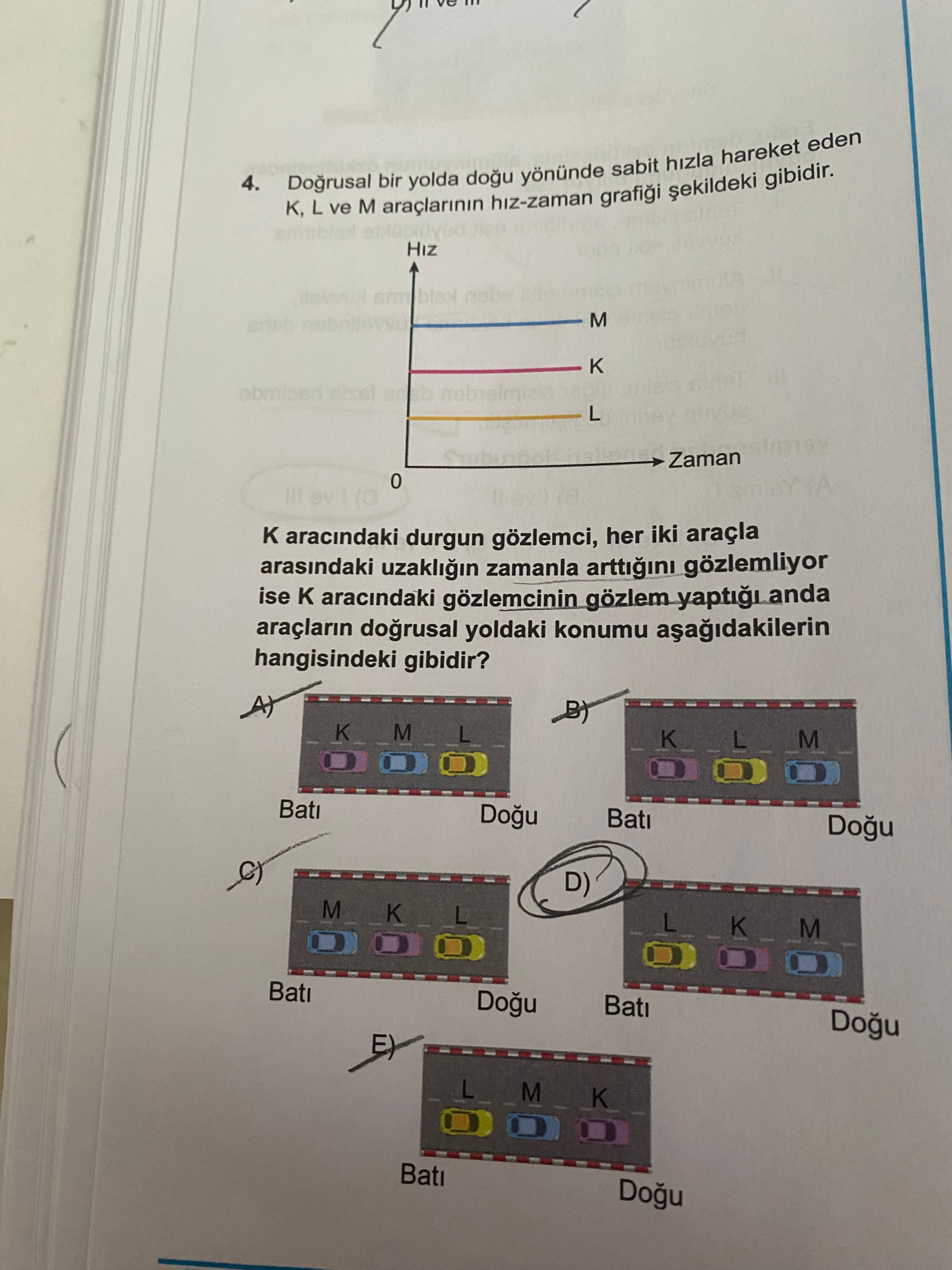 Genel açıklama: Görsel, üç aracın (K, L, M) sabit hızlarla doğuya hareket ettiği bir kinematik sorusunu içeriyor; hız-zaman grafiğine ve K aracındaki gözlemcinin uzaklık artışı gözlemine göre, o anda yol üzerindeki doğru konum düzeninin hangi seçenek olduğu soruluyor.