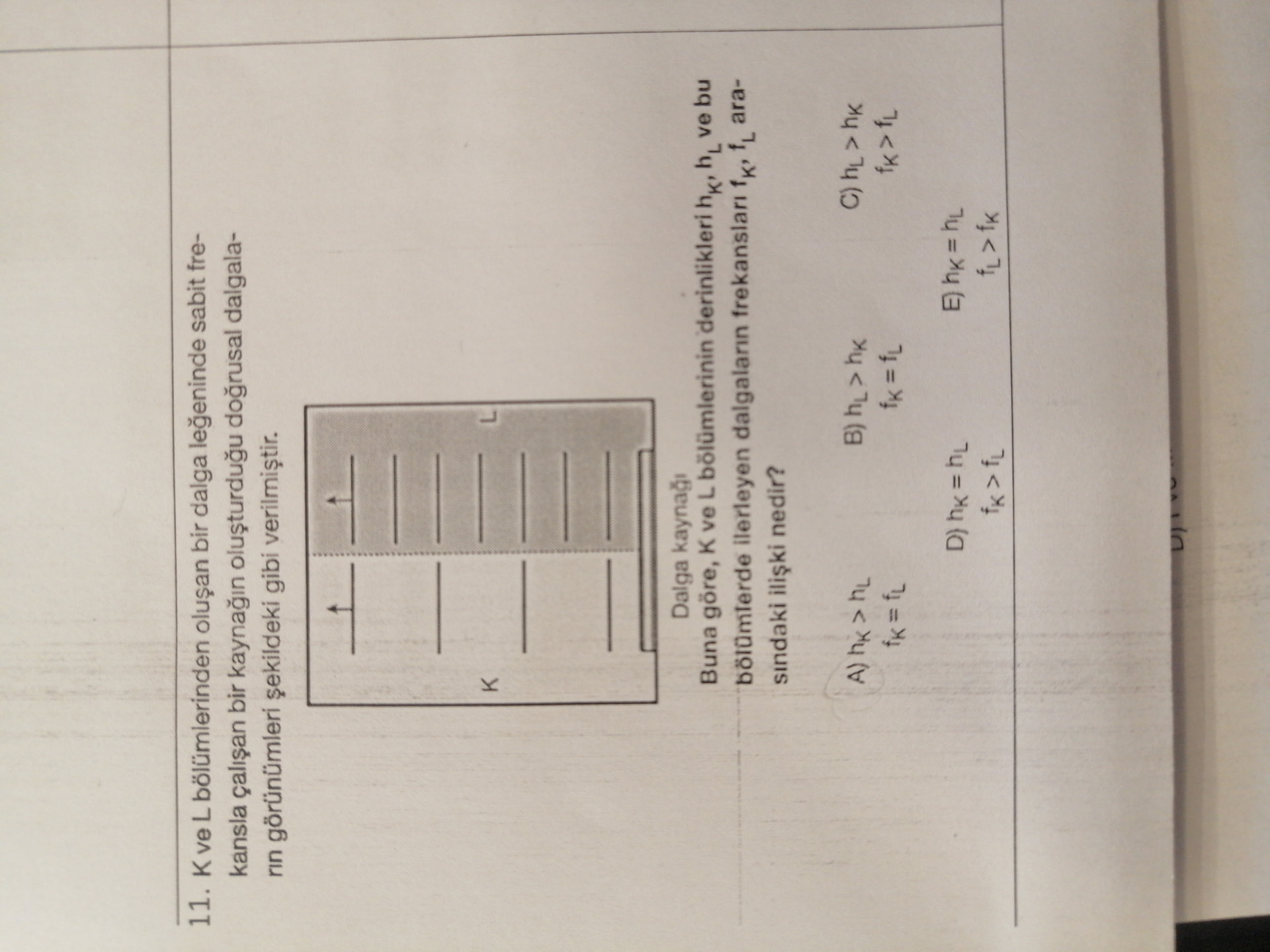 Resimde, K ve L bölümlerinden oluşan bir dalga leğeninde sabit frekansla çalışan bir kaynakla oluşturulmuş doğrusal dalgaların görünümü verilmiş. K kısmında dalga boyları L kısmına göre daha seyrek (yani \lambda_K > \lambda_L). Metnin yan kısmında (okunabildiği kadarıyla) bölmelerin derinlikleri h_K ve h_L, bu bölümlerde ilerleyen dalgaların frekansları f_K, f_L arasındaki ilişki soruluyor.