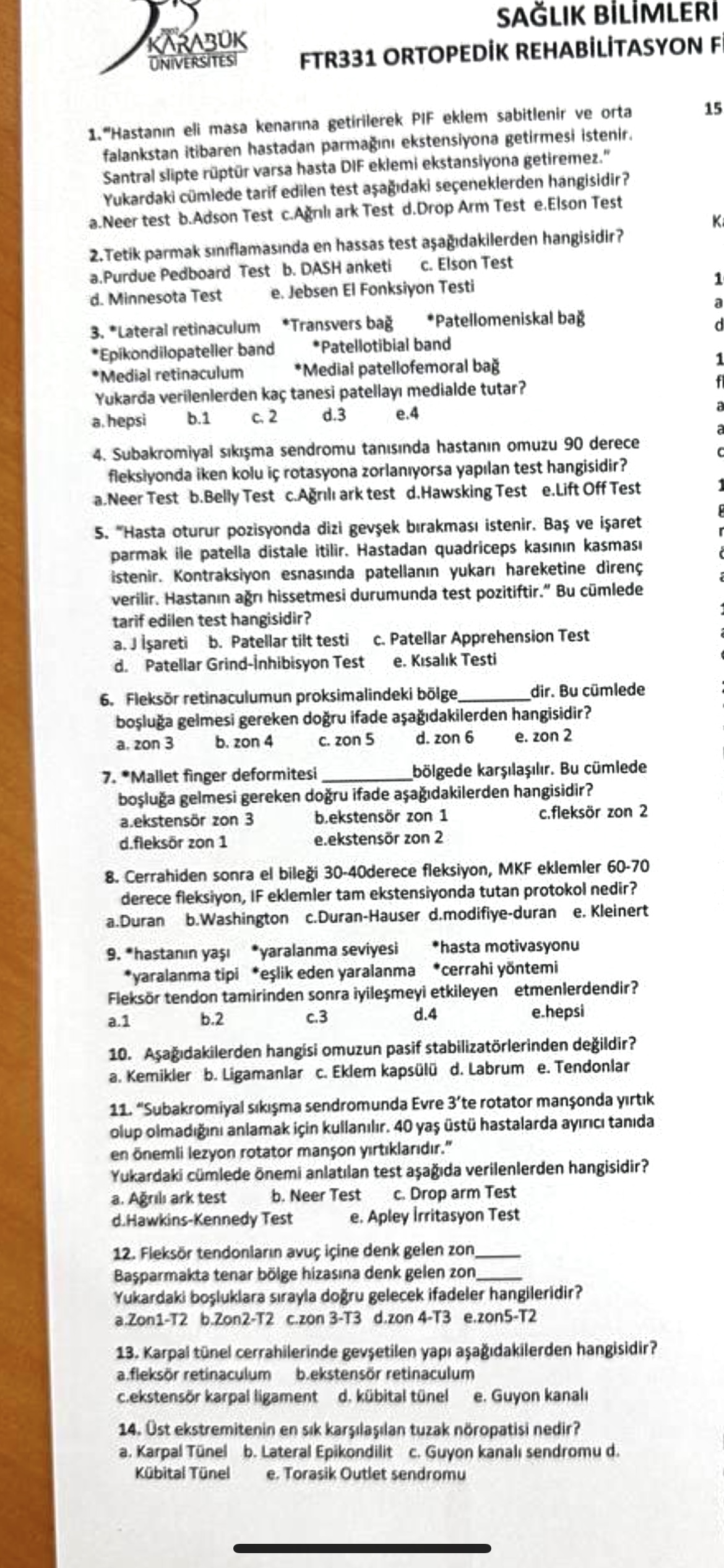 Bu görsel, Karabük Üniversitesi Sağlık Bilimleri bünyesinde FTR331 Ortopedik Rehabilitasyon dersi için hazırlanmış çoktan seçmeli sınav sorularını içeriyor. Sorular üst ekstremite patolojileri, tanısal özel testler, tendon zonları ve cerrahi/rehabilitasyon protokolleri gibi ortopedik rehabilitasyon konularını kapsıyor.