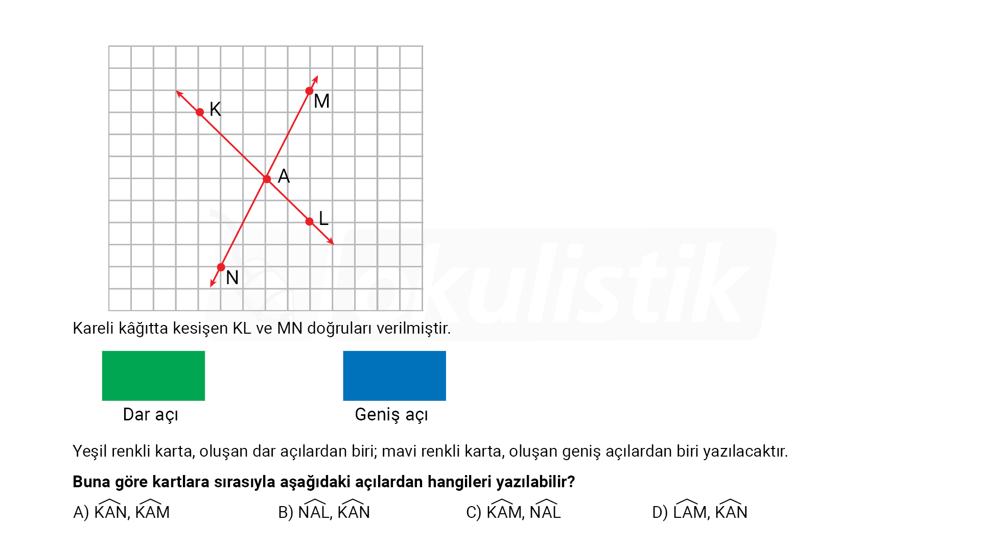 Açıklama: KL ve MN doğrularının kesişiminde A noktasında iki dar, iki geniş açı oluşur; görselde üst ve alt açılar (KÂM ve NÂL) dardır, sol ve sağ açılar (KÂN ve LÂM) geniştir. Bu yüzden yeşile NÂL, maviye KÂN yazılabilir.