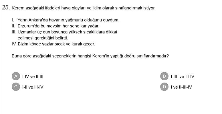 Bu soru, hava olayları ve iklimin doğru bir şekilde kategorize edilmesi üzerine kurulmuş. Örneğin, “yarın yağmur yağacak” bir hava olayı, “yazlar kurak ve sıcak geçer” ise iklim özelliği olarak sınıflandırılır. Soruda Kerem’in bu sınıflandırmayı nasıl yaptığına dair seçenekler verilmiş.