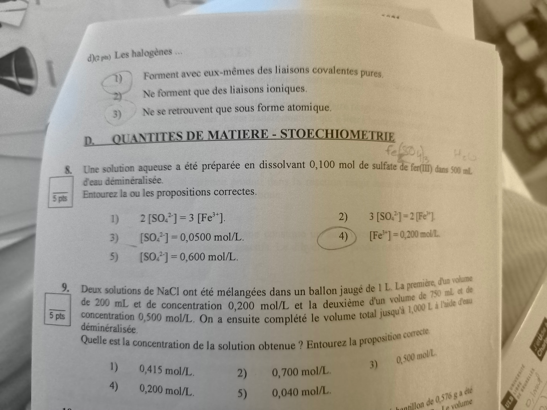 - Une solution aqueuse a été préparée en dissolvant 0,100 mol de sulfate de fer(III) dans 500 mL d’eau déminéralisée. Entourez la ou les propositions correctes.
