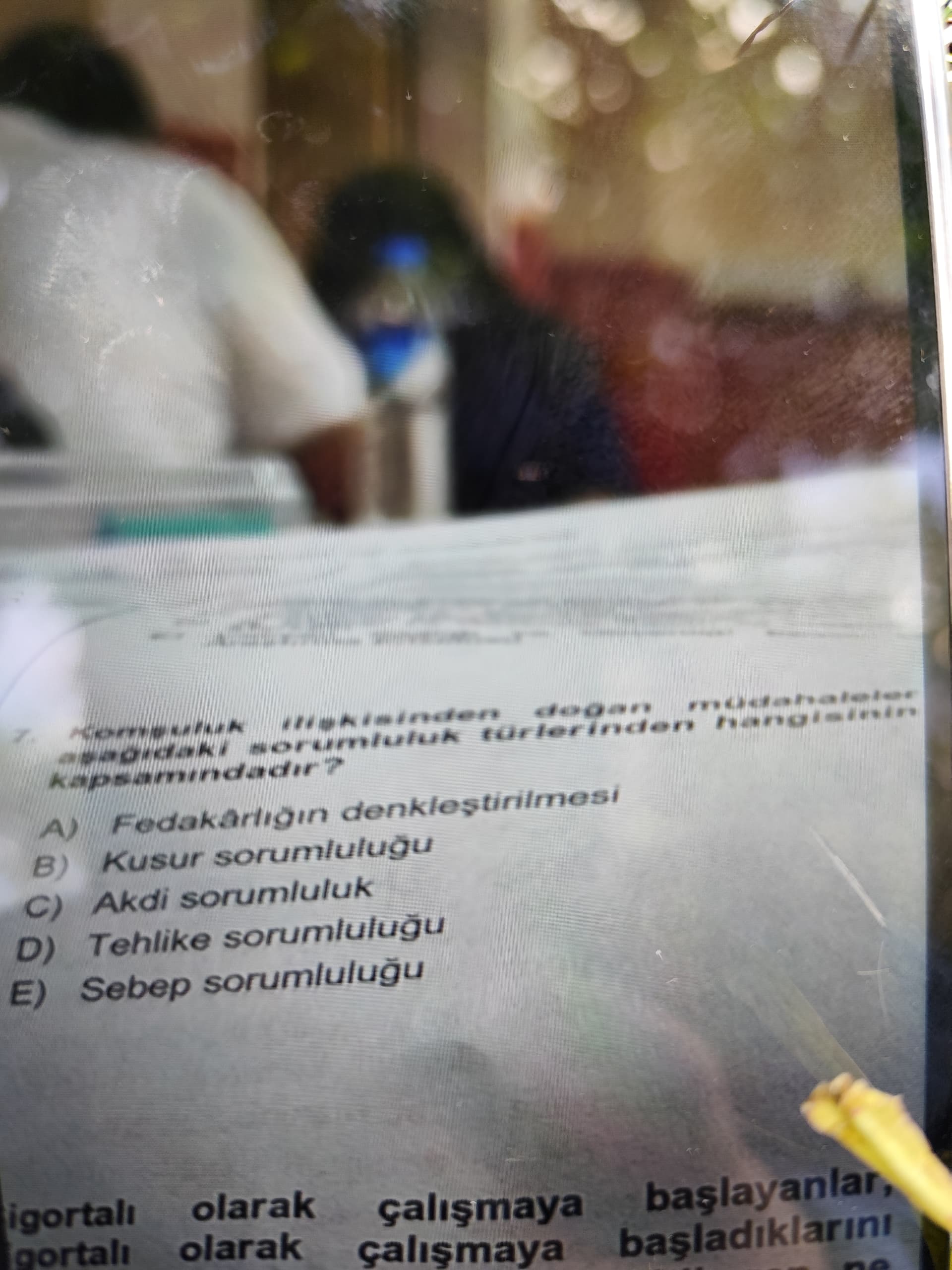 Bu resim, bir hukuk sınavı veya testi sorusunu içermektedir. Soru, komşuluk ilişkilerinden doğan müdahalelerin hangi sorumluluk türüne girdiğini sormaktadır. Şıklar, farklı sorumluluk tiplerini içermektedir.