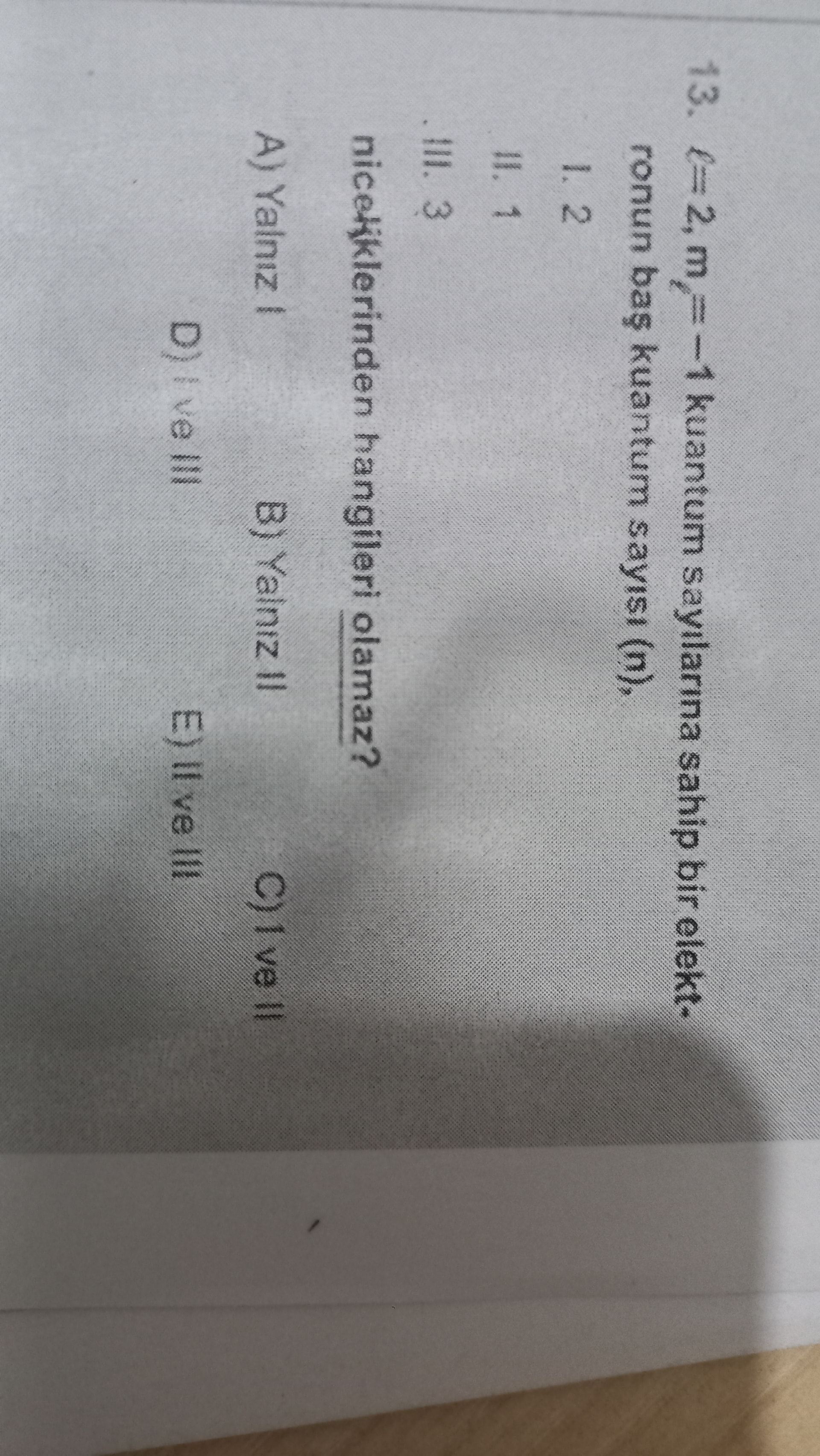 Genel açıklama: Görsel, kuantum sayılarıyla ilgili çoktan seçmeli bir soru içeriyor; verilen l ve m_l değerlerine göre baş kuantum sayısı n için olamayacak seçeneklerin sorulduğu bir kimya/atom fiziği konusuna ait.