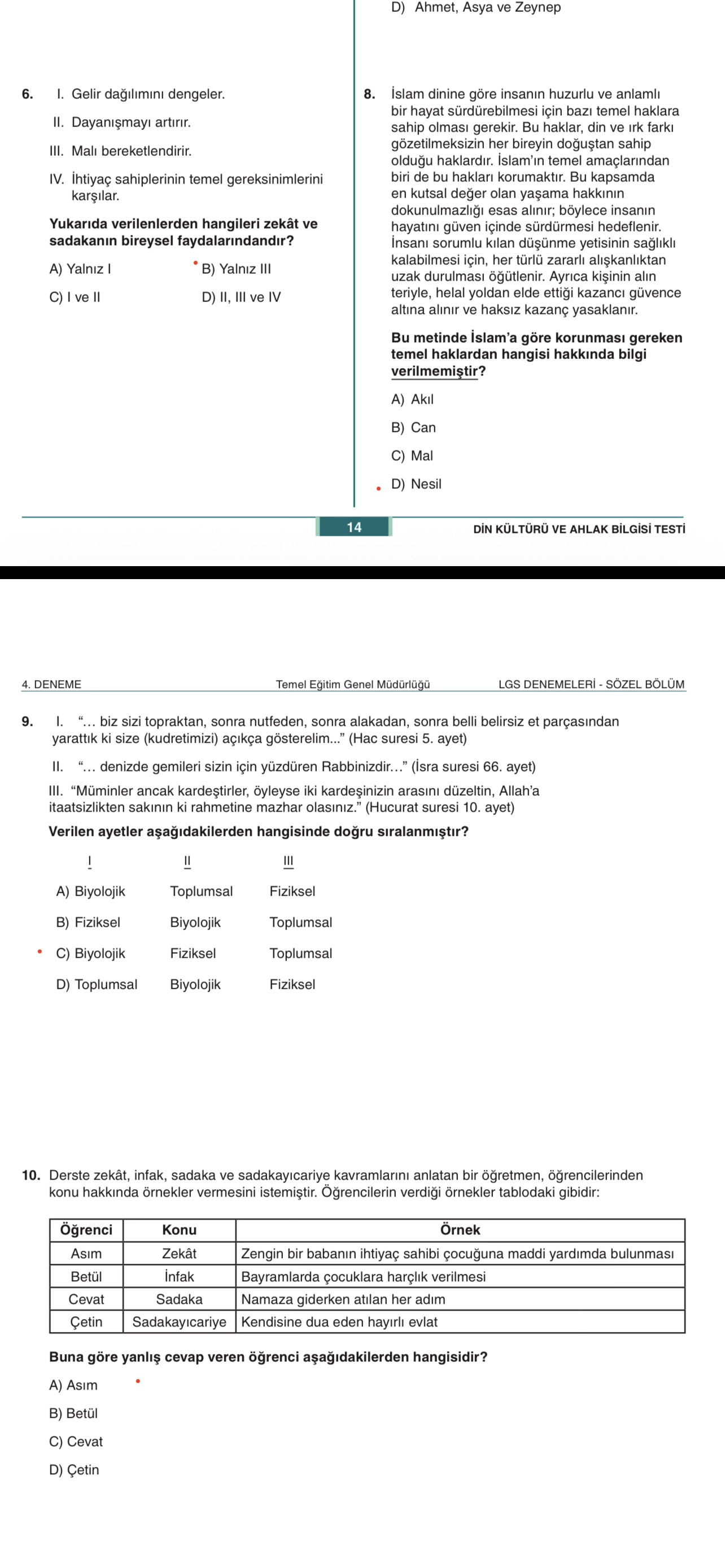 Özet: Görsellerde LGS Din Kültürü ve Ahlak Bilgisi deneme sınavının 10 soruluk bölümü yer almakta; ayet ve hadislerden hareketle İslam’da korunması gereken haklar (akıl, can, mal, din, nesil), sadaka ve zekâtın bireysel/toplumsal yönleri, dinin tanımı ve işlevleri, ayetlerin konu sınıflaması ile zekât–infak–sadaka–sadaka-i cariye kavramlarına ilişkin örnekler sorulmaktadır.