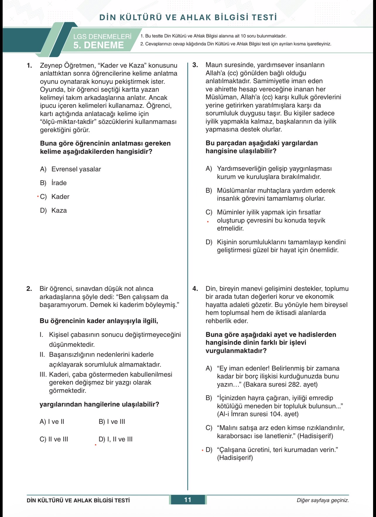 Bu görseller, LGS Din Kültürü ve Ahlak Bilgisi denemesinin 10 soruluk bir bölümünü içeriyor. Sorular; kader-kaza ve irade, Maun ve Asr surelerinin mesajları, Hz. Muhammed’in güvenilirliği, aile hayatının önemi, Hz. Yusuf’un sabır ve tevekkülü, temel hakların (din, can, mal, akıl) korunması ve malın korunmasına ilişkin ayetlerle ilgilidir; bir tablo sorusu ve çoktan seçmeli maddeler yer almaktadır.