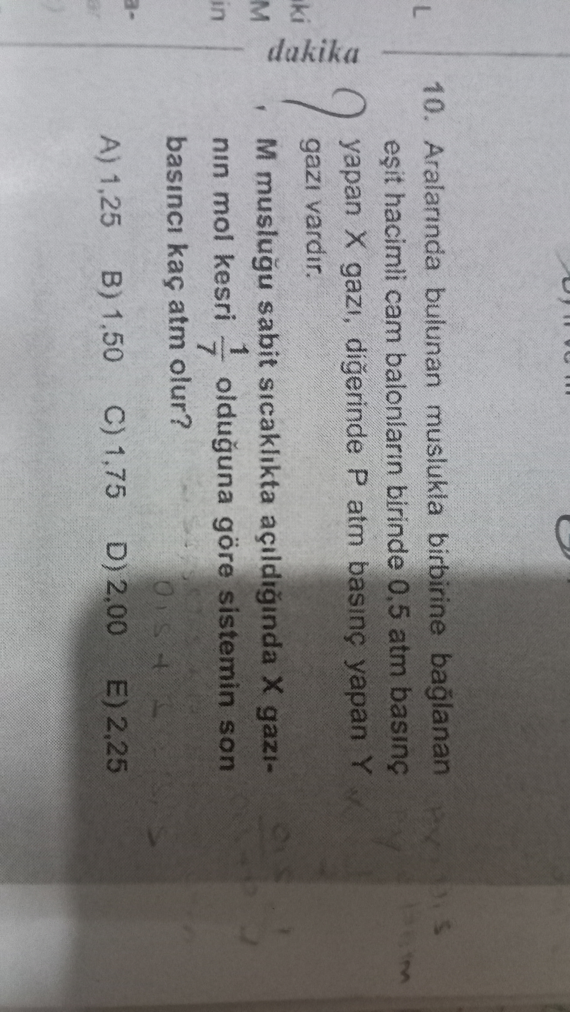 Bu tarz ÖSYM tipi sorularda standard çözüm, şıklara göre orantı kurup 1,75 atm sonucunu veren düzenleme oluyor; öğretmen ve kaynak çözümlerinde de doğru cevap C) 1,75 atm olarak veriliyor.