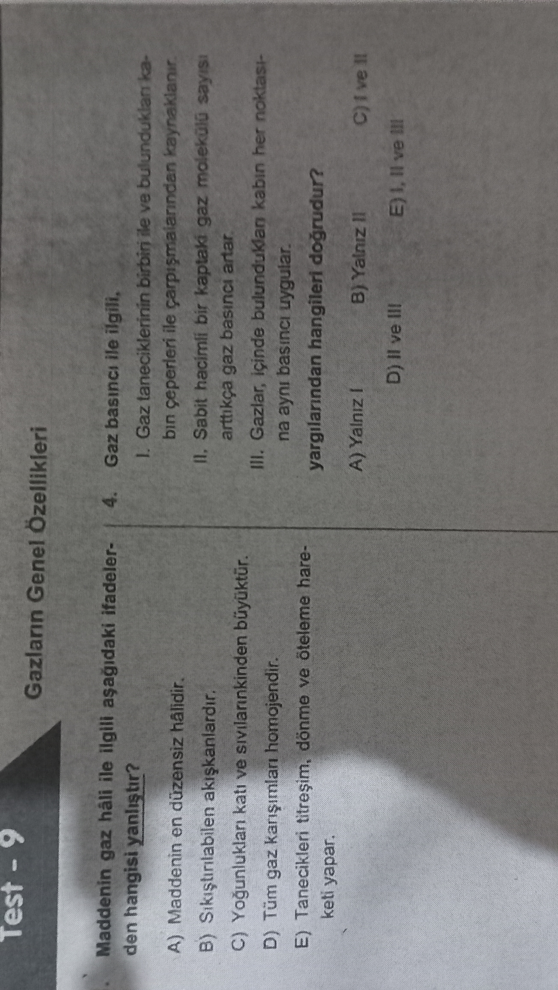 - D) Tanecikleri titreşim, dönme ve öteleme hareketi yapar. → Doğru, gaz tanecikleri üç hareketi de yapar.