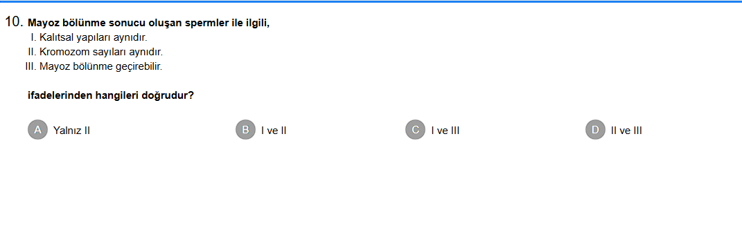 Açıklama: Mayoz sonucu oluşan spermler haploiddir, yani hepsinin kromozom sayısı aynıdır (II doğru). Ancak crossing‑over ve homolog kromozomların bağımsız dağılımı nedeniyle kalıtsal yapıları genellikle farklıdır (I yanlış). Ayrıca sperm zaten mayoz sonucunda oluşmuş gamettir; gametler tekrar mayoz geçirmez (III yanlış).