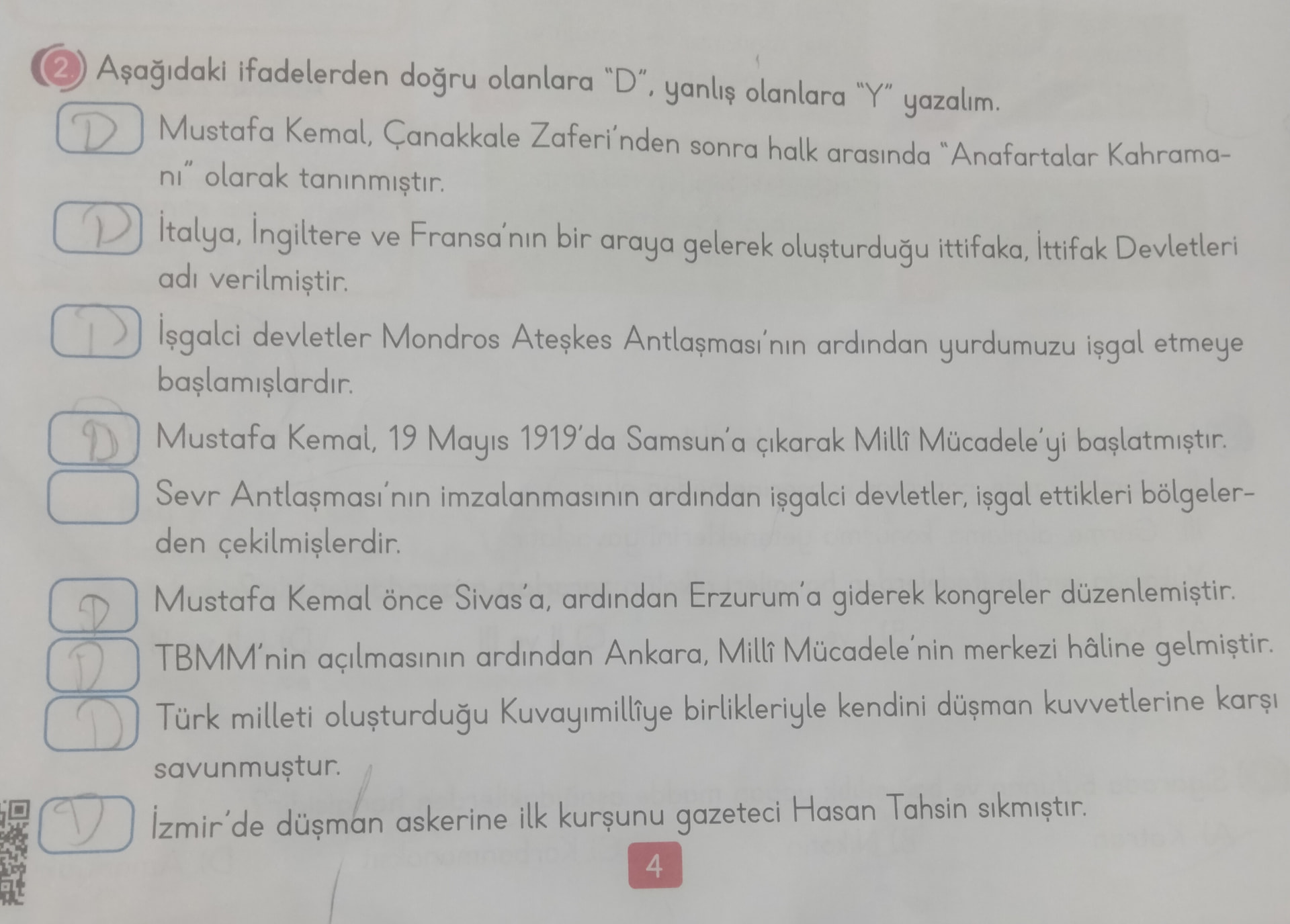 Özet: Görselde, Millî Mücadele dönemiyle ilgili 9 ifadeden doğru olanların “D”, yanlış olanların “Y” ile işaretlenmesi istenmektedir. Mustafa Kemal’in rolü, Mondros ve Sevr antlaşmaları, TBMM’nin açılması, Kuvayımilliye ve Hasan Tahsin gibi konular yer almakta; cevaplar sırasıyla D, Y, D, D, Y, Y, D, D, D olarak işaretlenmiştir.
