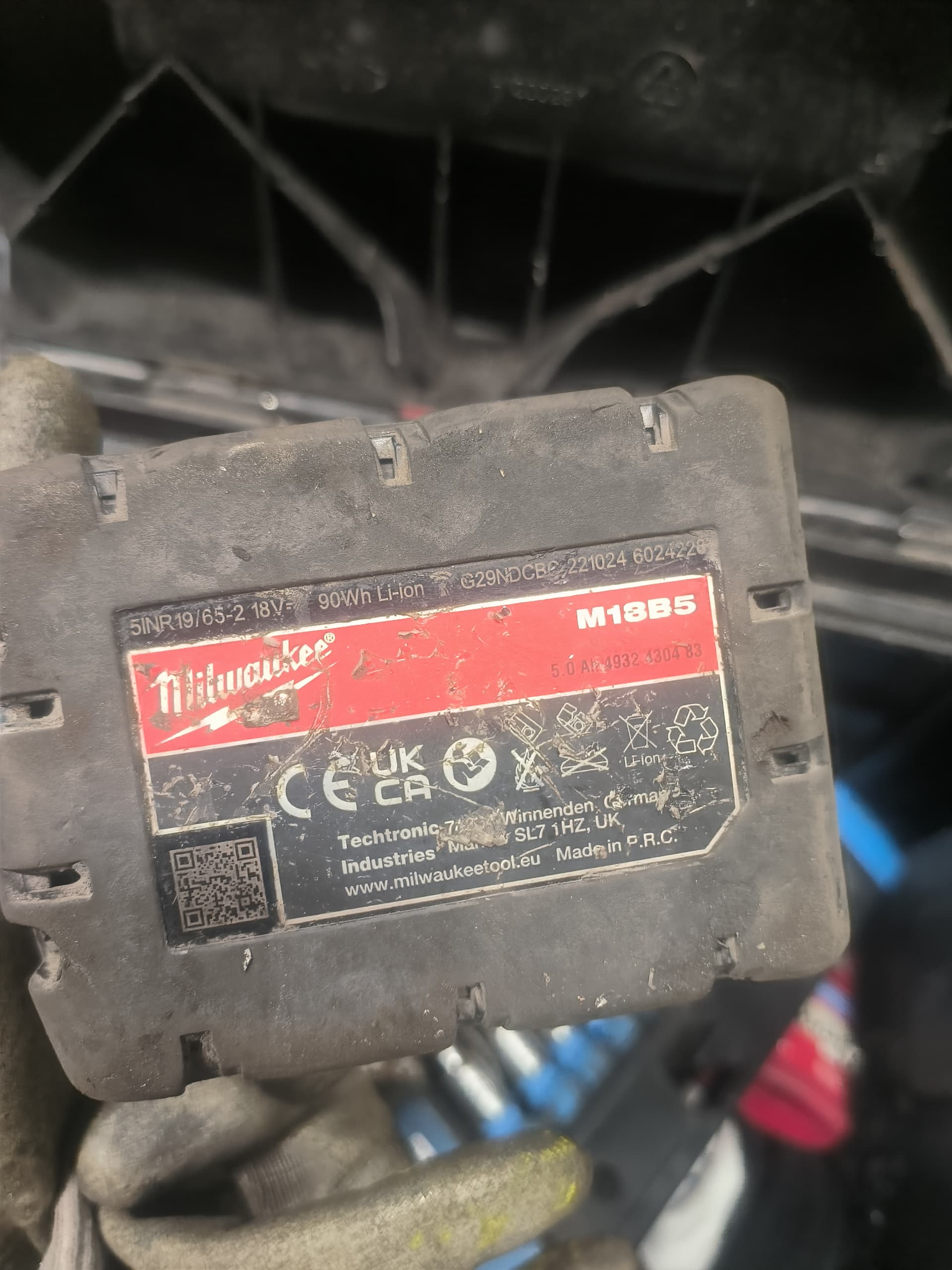 Bu resim, bir Milwaukee marka elektrikli el aletine ait bataryanın etiketi üzerinde yer alan bilgileri göstermektedir. Etiket üzerinde bataryanın modeli (M18B5), kapasitesi (5.0 Ah), voltajı (18V) ve kullanılan teknoloji (Li-ion) gibi teknik detaylar yer almaktadır. Ayrıca, üretici firmaya dair bilgiler ve çeşitli güvenlik ve uyumluluk işaretleri bulunmaktadır.
