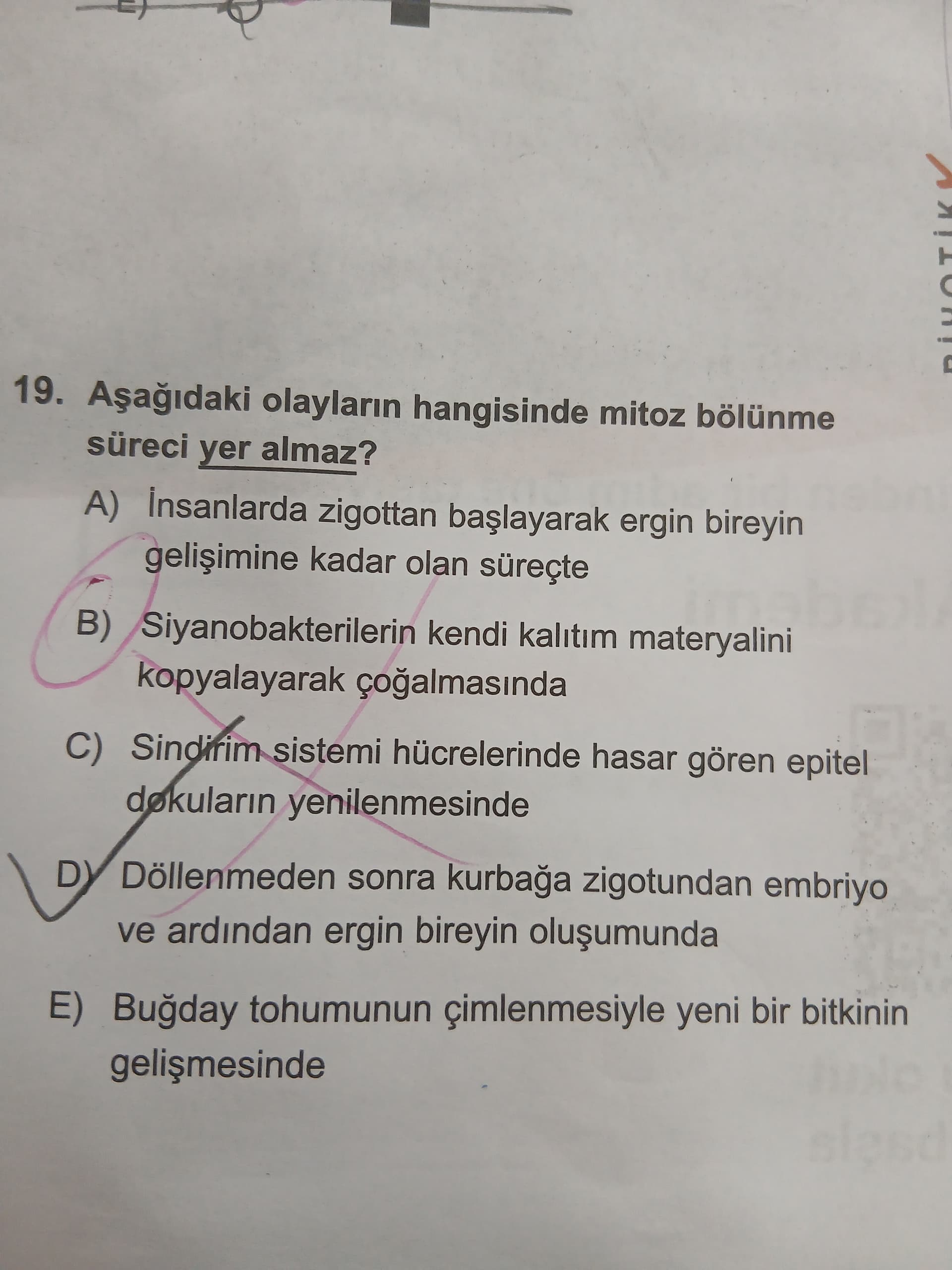 Kısa açıklama: A, C, D ve E şıkları zigotun gelişimi, doku yenilenmesi ve bitki çimlenmesi gibi ökaryotik hücrelerde gerçekleşen mitotik çoğalmaya örnektir; B şıkkında DNA kopyalanır ama mekanizma mitoz değildir.