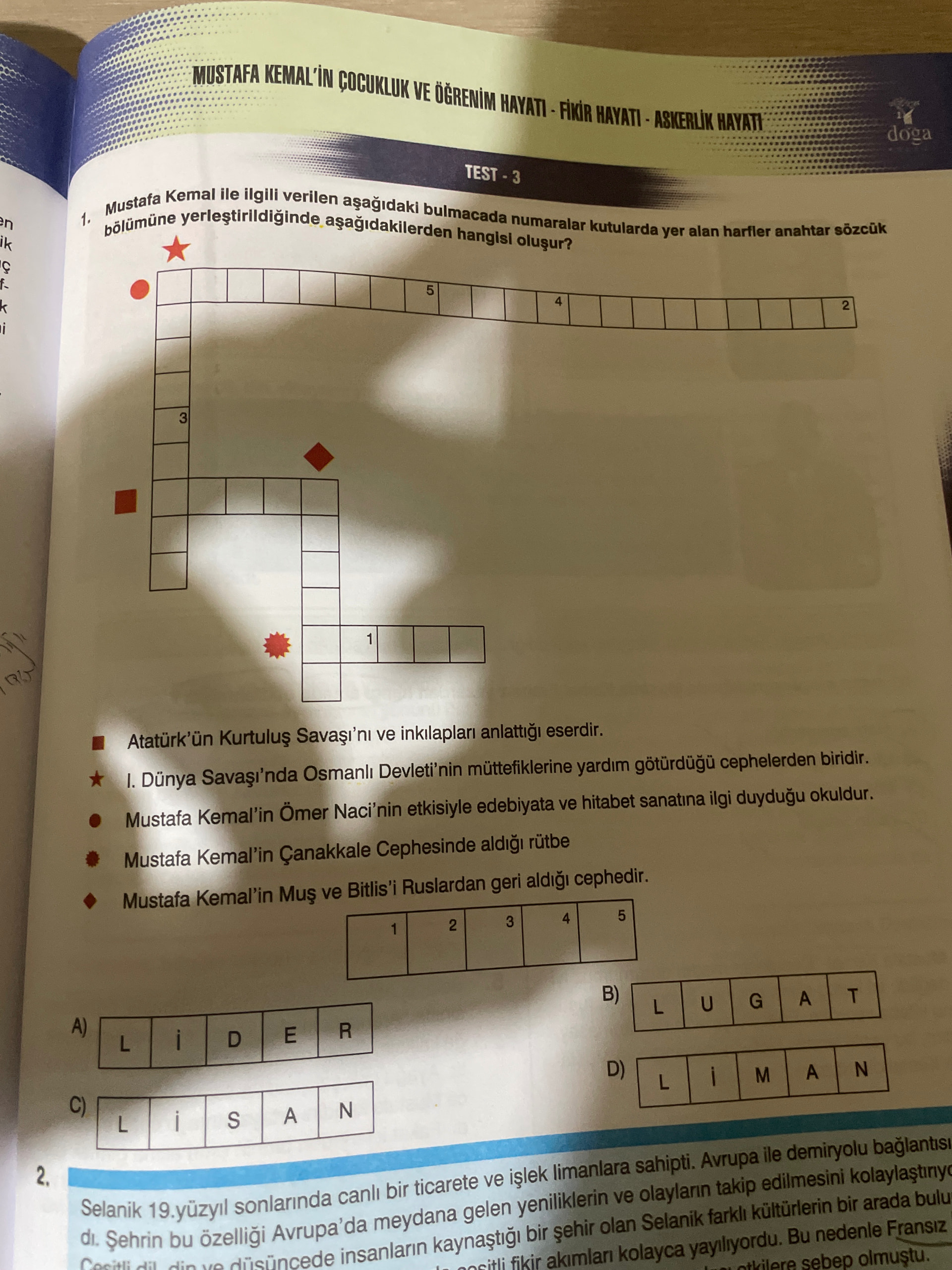 Bulmacada Mustafa Kemal’in çocukluk ve askeri hayatı ile ilgili harfleri bulmacaya yerleştirme sorusu var. Alt kısımda verilen kutulardaki kelimeler “Lider, Lugat, Selanik, Asker, Manastır”.