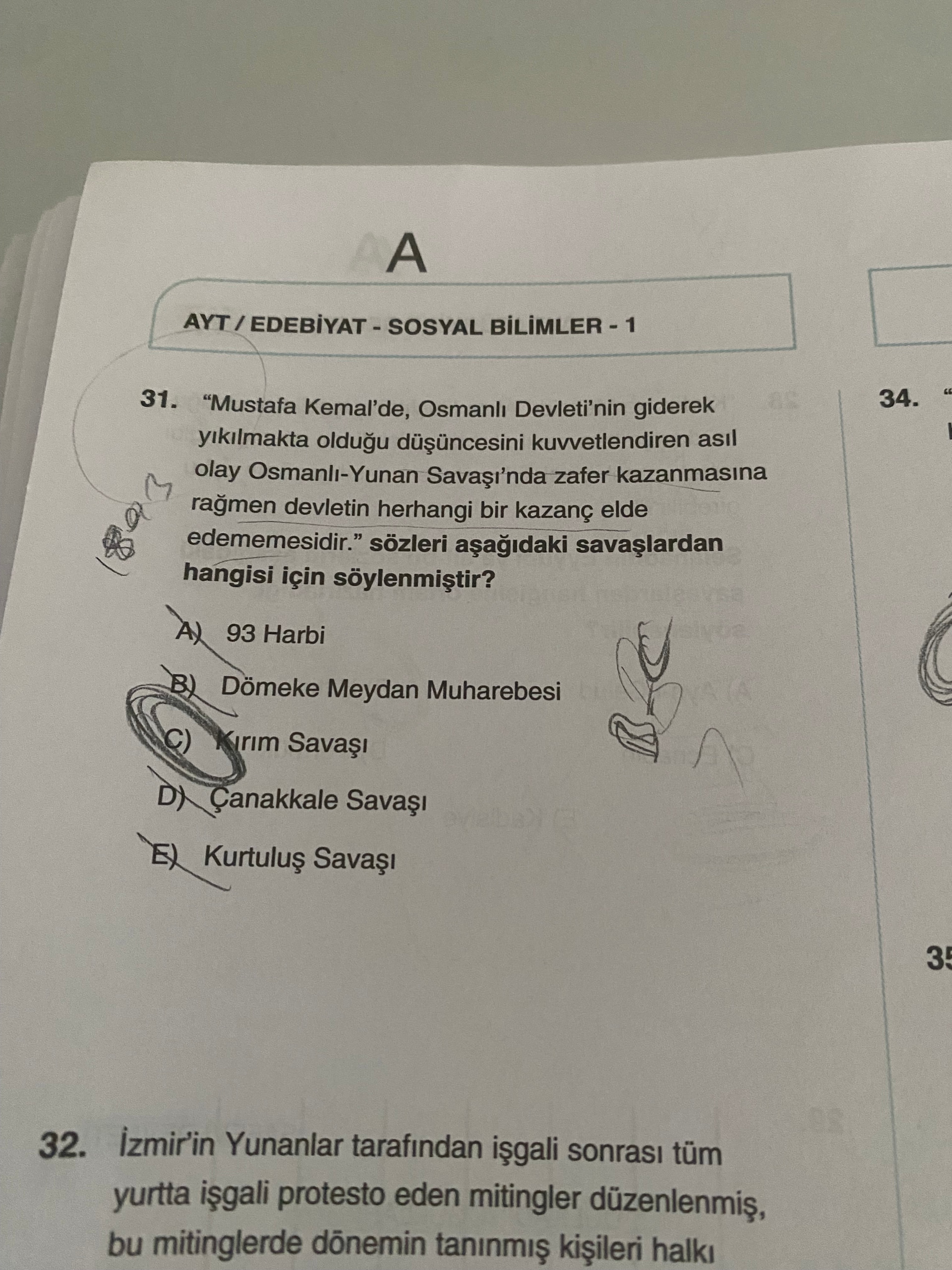 Genel açıklama: Görsel, AYT Edebiyat-Sosyal Bilimler testinden bir sayfayı içeriyor; Osmanlı tarihi ve Milli Mücadele dönemiyle ilgili savaşlar ve işgaller üzerine sorular yer alıyor.