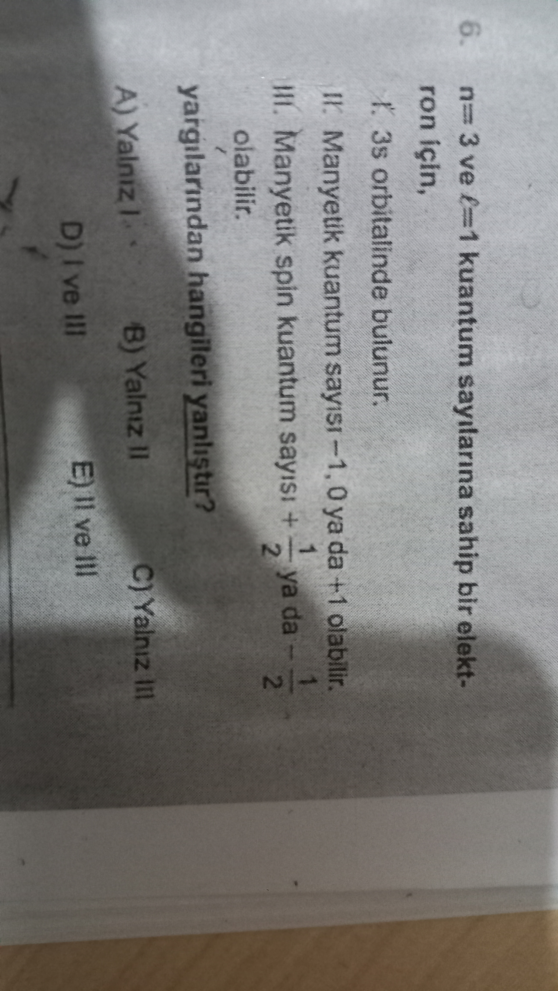 II. “Manyetik kuantum sayısı -1 , 0 ya da +1 olabilir.”