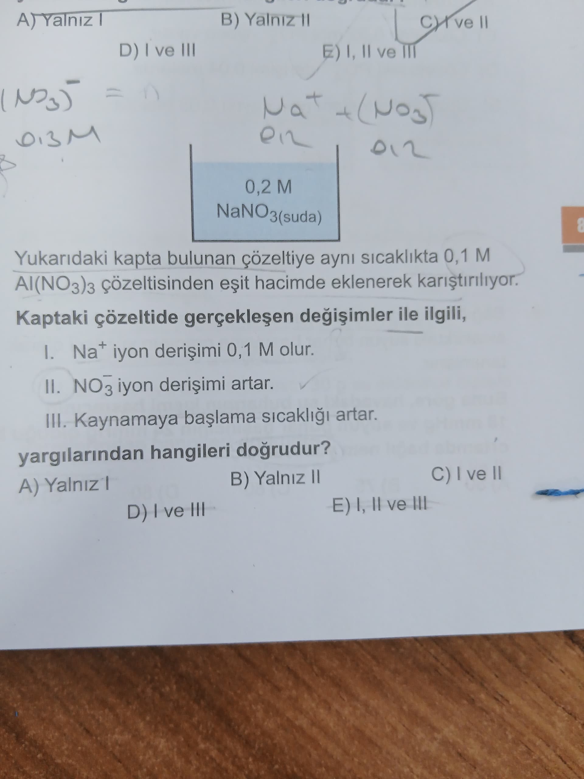 - NO3- mol sayısı: 0,2V (NaNO3’den) + 3·0,1V (Al(NO3)3’ten) = 0,5V → yeni [NO3-] = (0,5V)/(2V) = 0,25 M. Başlangıçtaki [NO3-] = 0,2 M olduğundan NO3- derişimi artar ⇒ II doğru.