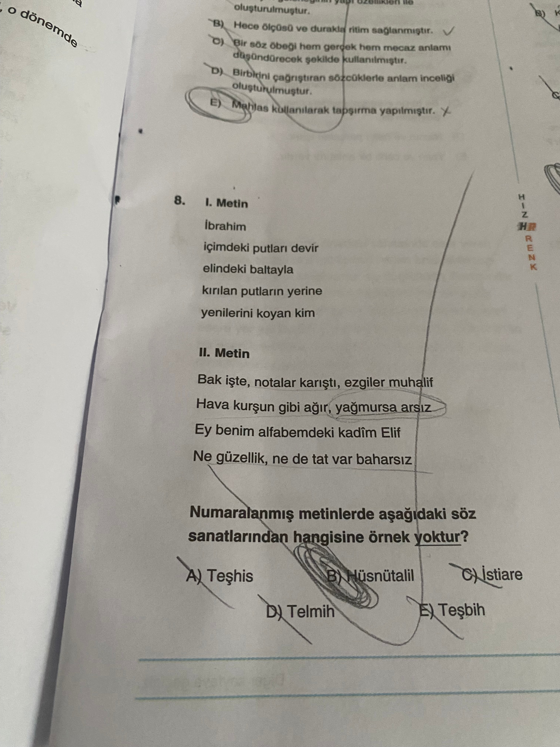 Bu resim, Türkçe edebiyat/dil bilgisi konulu bir test sayfası; şiirlerden alınan iki kısa metne dayanarak hangi söz sanatlarının kullanıldığına ilişkin çoktan seçmeli bir soruyu içeriyor.