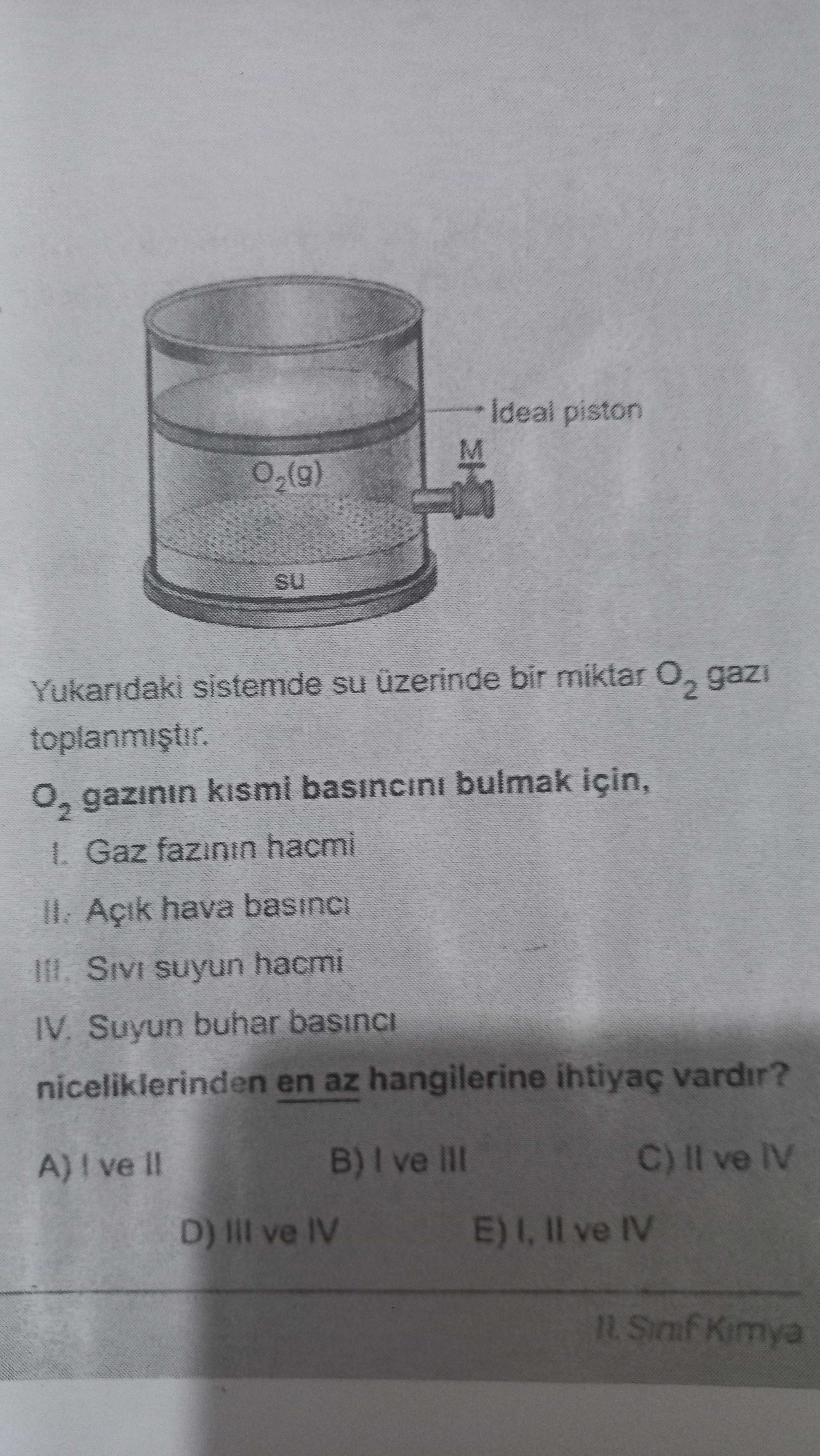 - II ve IV (C): Bu ikisiyle P_{O_2} = P_{\text{açık hava}} - P_{\text{su buharı}} bulunur; fakat soru “en az hangilerine ihtiyaç vardır?” dediğinde, tipik sınav mantığında hacim de (I) hesaba katılır, hem de ideal gaz bağıntısında kullanılır.