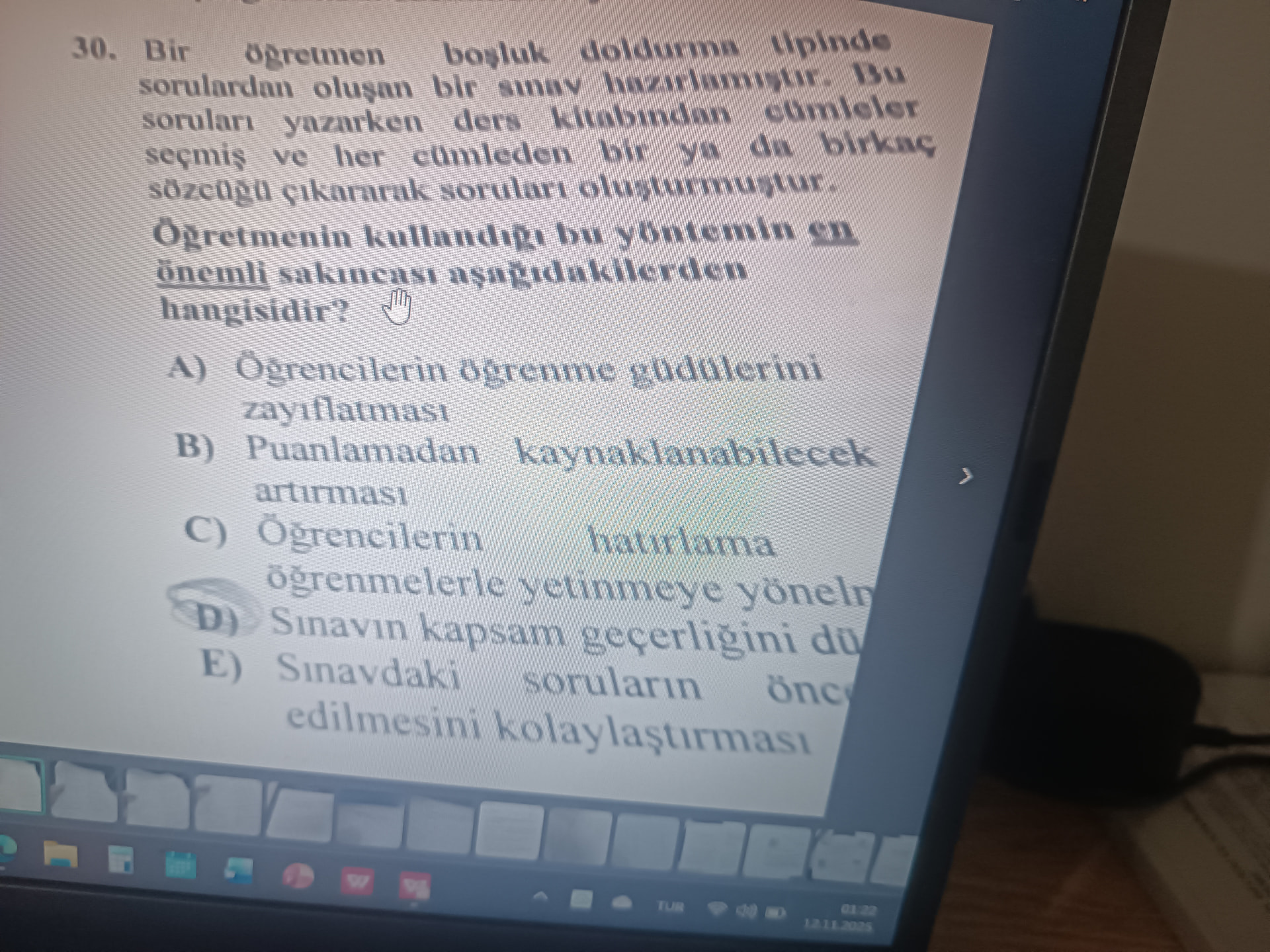 Görüntü, ölçme ve değerlendirme alanında, öğretmenin ders kitabından alınan cümlelerle oluşturduğu boşluk doldurma türü bir sınavın sakıncalarını sorgulayan çoktan seçmeli bir soru içermektedir.