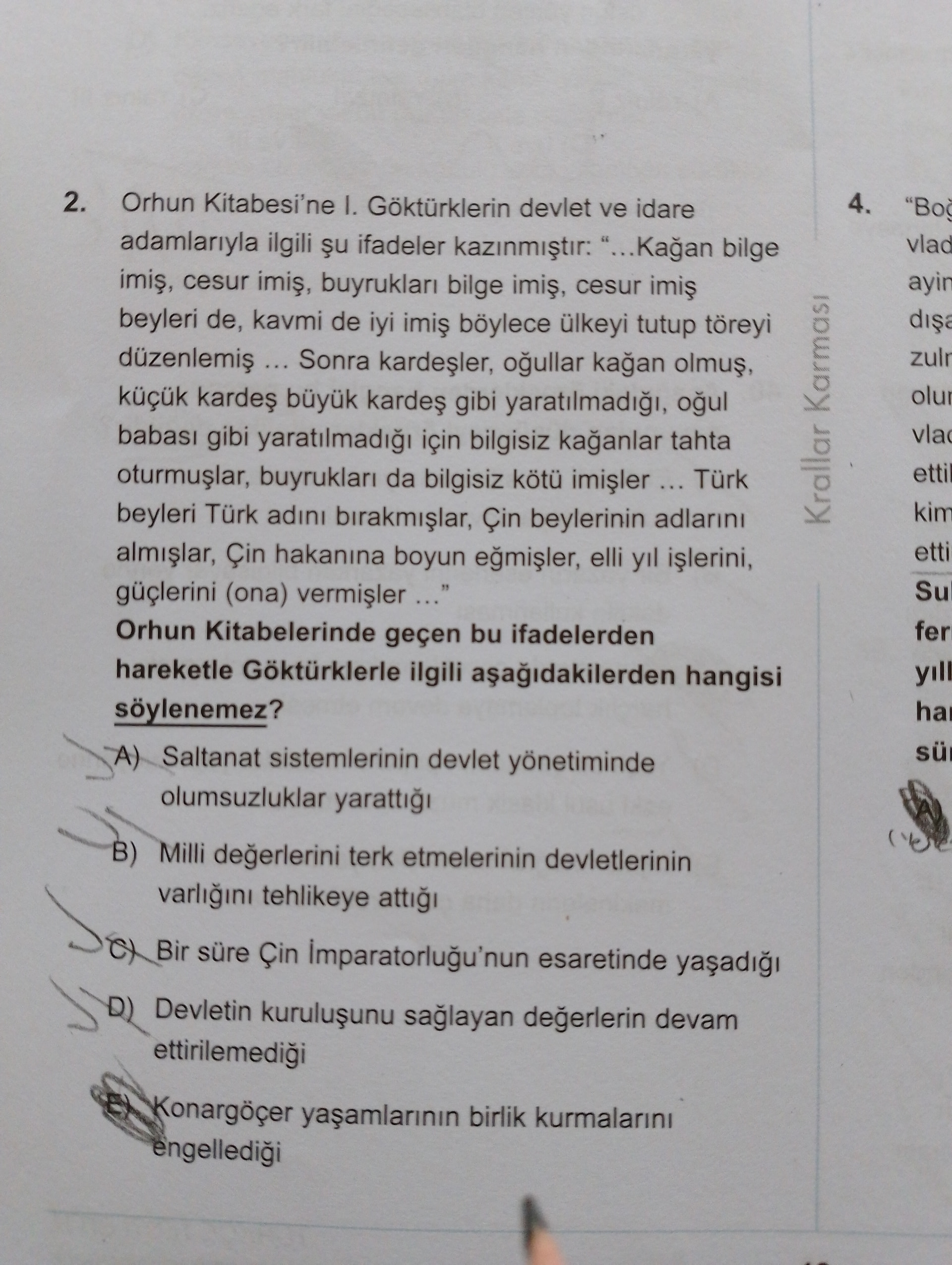 Tüm resimler genel olarak Orhun Kitabeleri’nden alınan ifadeler üzerinden Göktürklerin yönetimi ve toplumsal değerleriyle ilgili bir çoktan seçmeli tarih sorusunu konu alıyor.