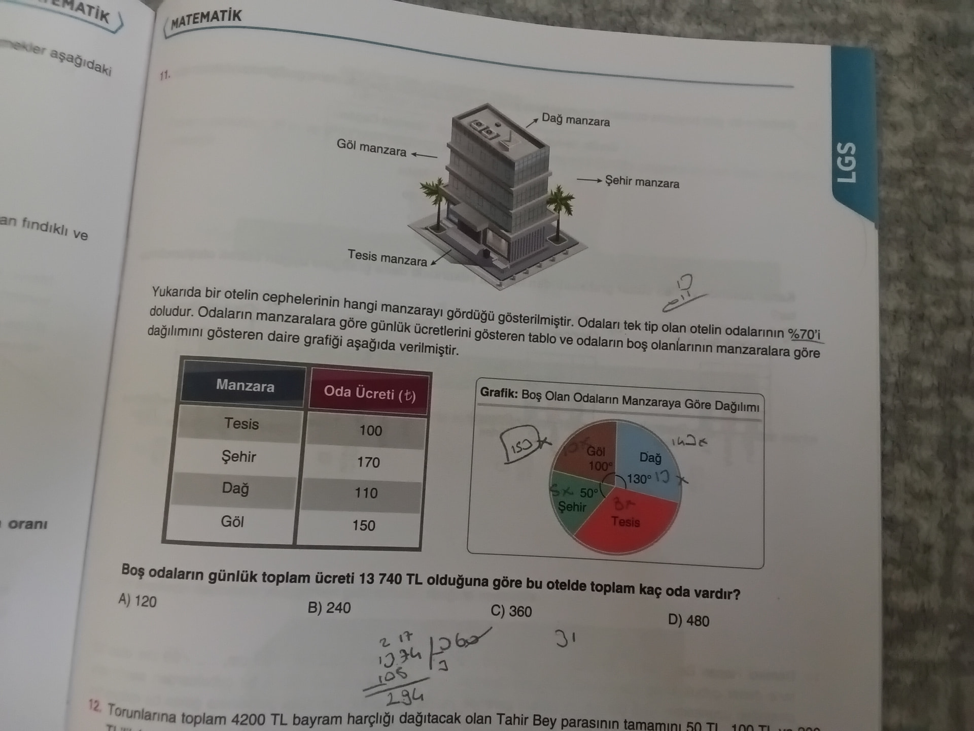 Sayfada, bir otelin odalarının %70 dolu olduğu bilgisi verilerek boş odaların manzaralara göre dağılımı (dağ 130^\circ, şehir 50^\circ, göl 100^\circ, tesis kalan dilim) ve her manzara için günlük oda ücretlerinin bulunduğu bir tablo yer alıyor. Boş odaların günlük toplam ücretinin 13 740 TL olduğu verilerek oteldeki toplam oda sayısı soruluyor; şıklar 120, 240, 360 ve 480. Ayrıca birkaç kısa el yazısı notu bulunuyor.