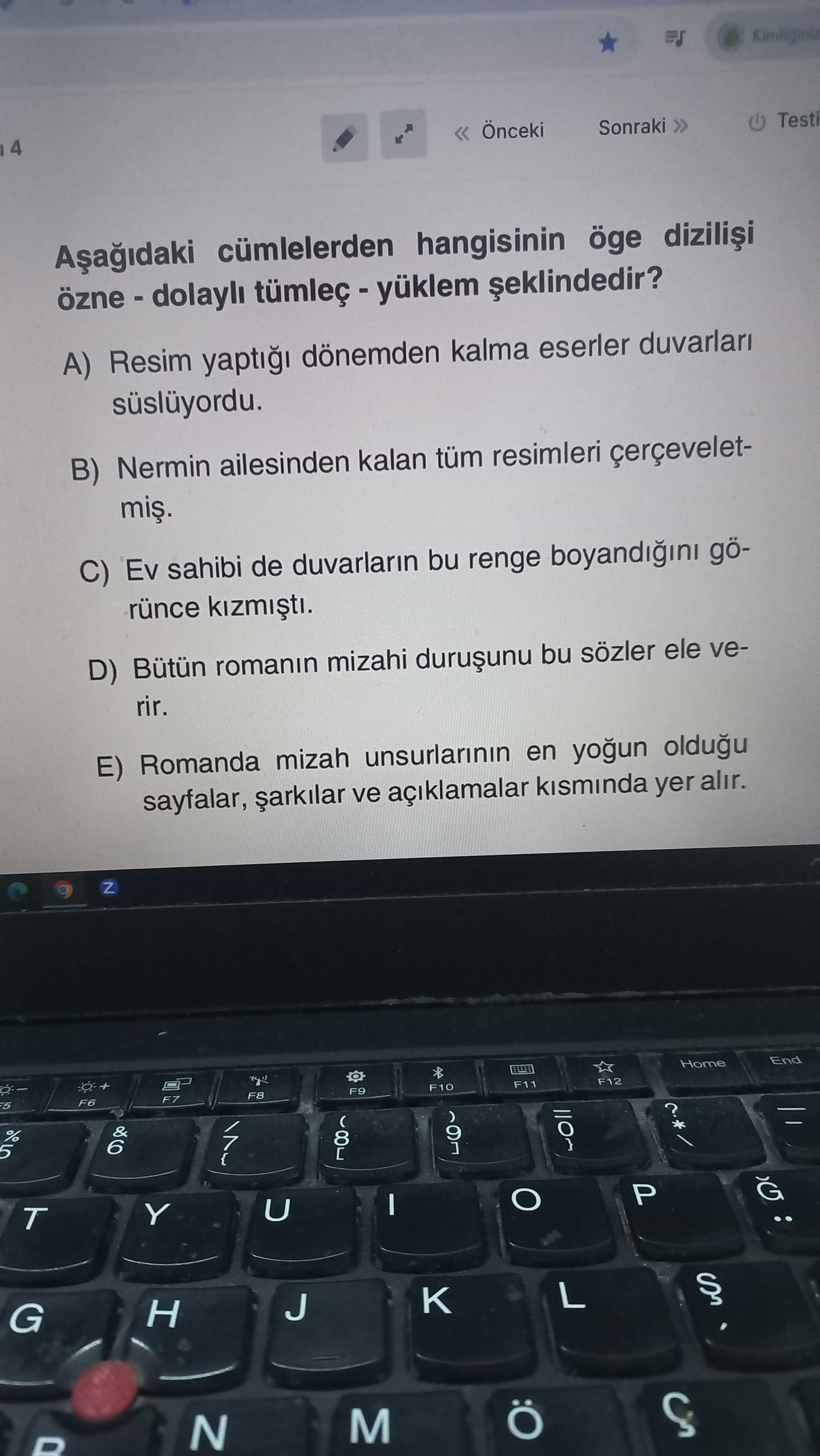 Özet: Görsel, Türkçe bir test ekranında “özne - dolaylı tümleç - yüklem” dizilişini soran çoktan seçmeli bir soruyu ve A-E şıklarındaki cümleleri göstermektedir.