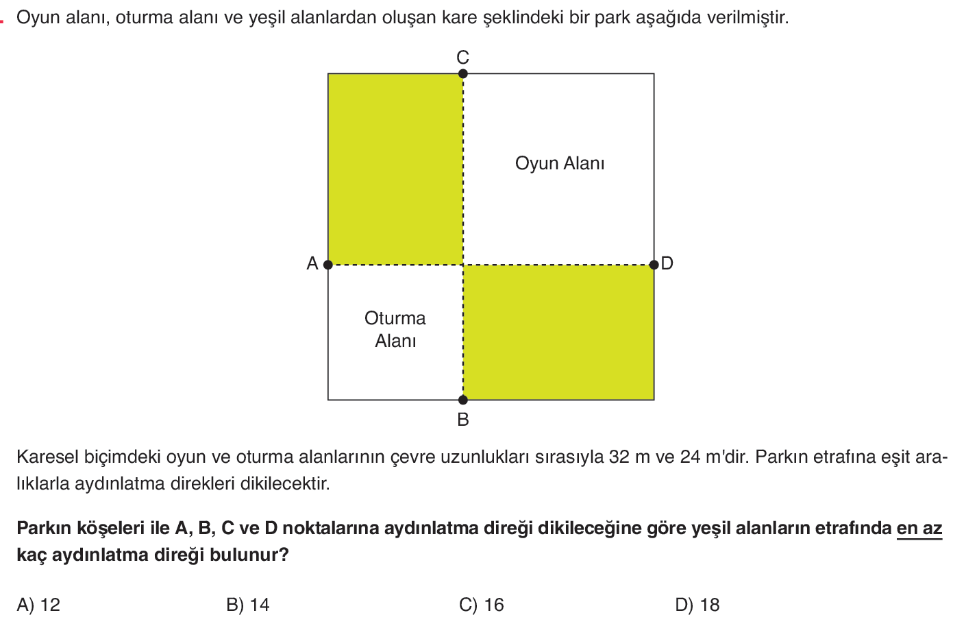 Parkın köşeleri ile A, B, C ve D noktalarına aydınlatma direği dikileceğine göre yeşil alanların etrafında en az kaç aydınlatma direği bulunur?