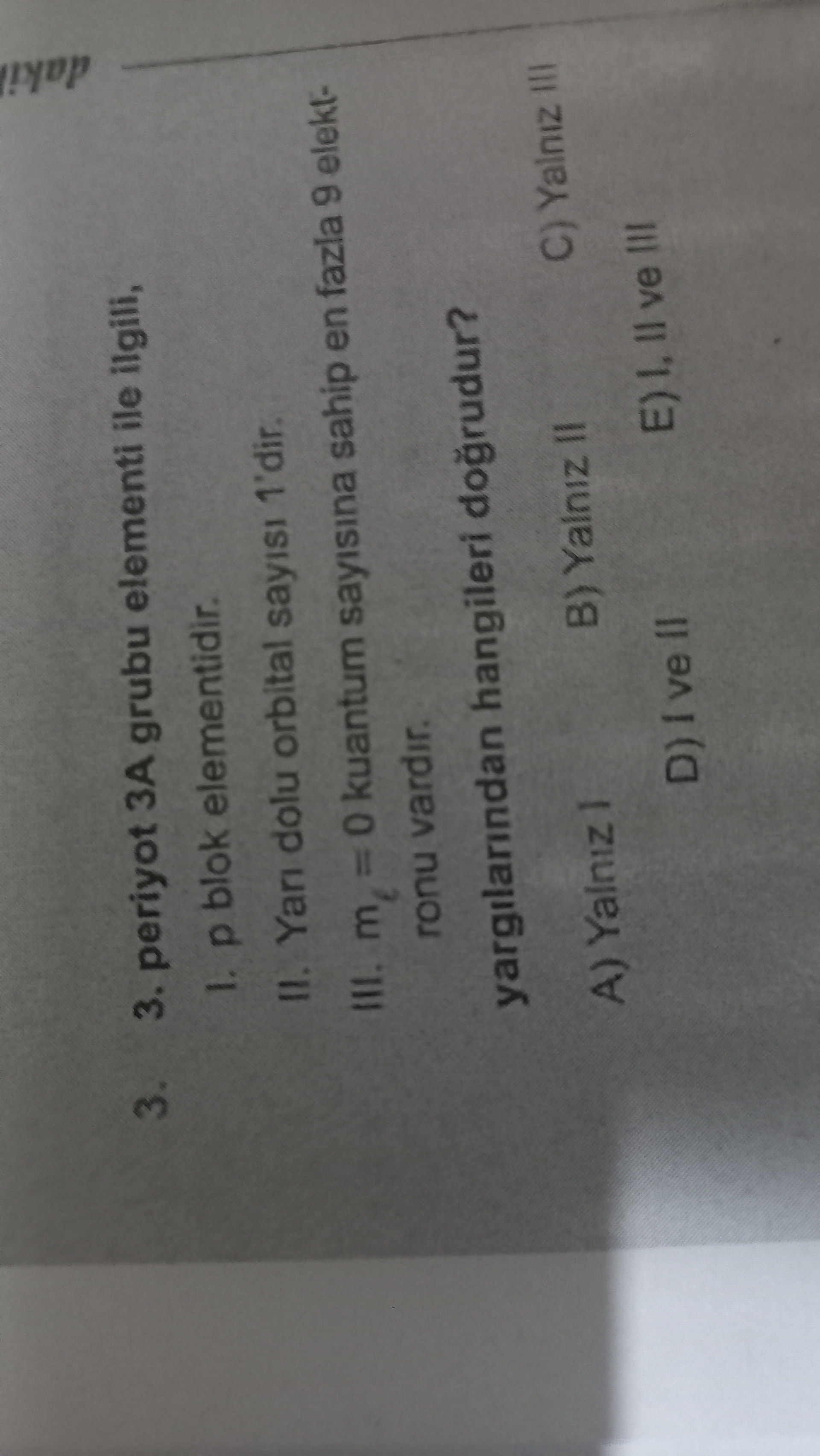 Genel açıklama: Görsel, kimya alanında çoktan seçmeli bir soru içeriyor; 3. periyot 3A grubu elementinin özellikleri ve kuantum sayılarıyla ilgili yargıların doğruluğunu sorguluyor.