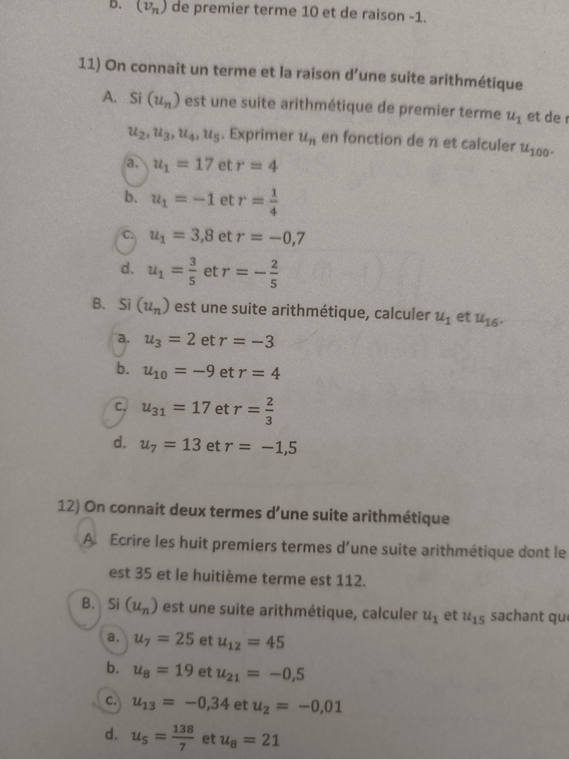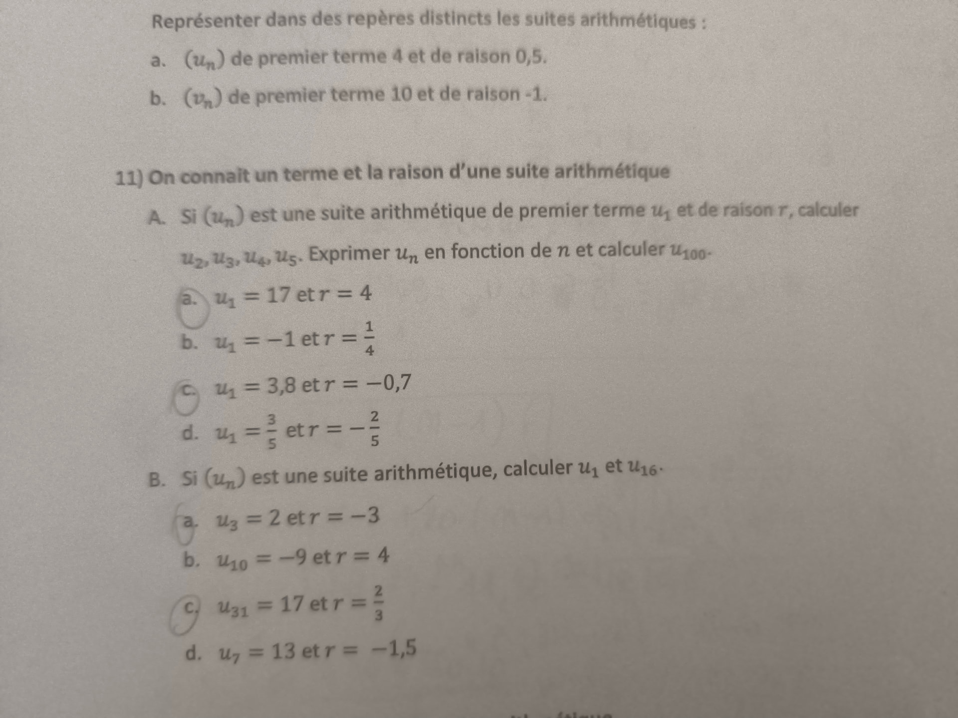 A. Si (u_n) est une suite arithmétique de premier terme u_1 et de raison r, calculer u_2, u_3, u_4, u_5. Exprimer u_n en fonction de n et calculer u_100.
