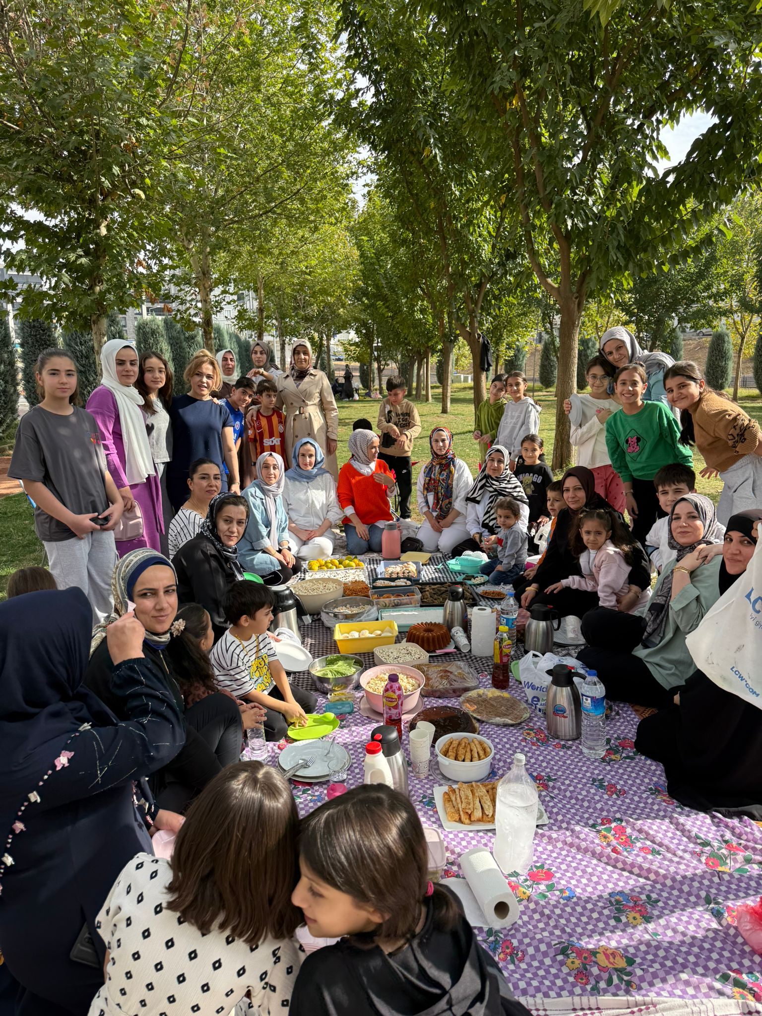 Genel olarak, resim bir piknik etkinliği sırasında çekilmiş gibi görülüyor. Çoğunluğu kadın ve çocuklardan oluşan bir grup insan, çeşitli yiyeceklerin bulunduğu bir alanda toplanmış. Etkinlik açık havada, ağaçlık bir alanda gerçekleştiriliyor ve katılımcılar piknik örtüsü üzerinde oturuyor. Görüntü, sosyal bir etkinlik veya aile buluşması gibi bir ortamı tasvir ediyor.
