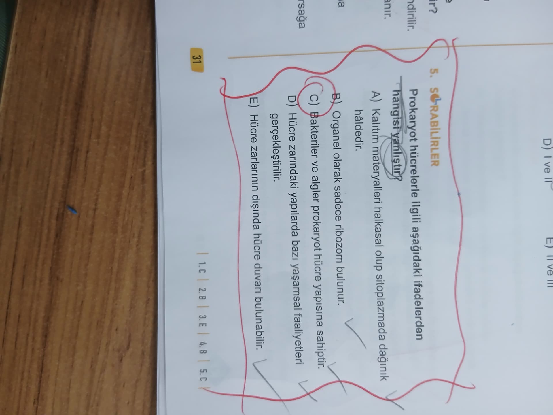 Açıklama: Bakteriler prokaryottur; ancak “algler” (çoğu deniz ve tatlısu algi) büyük çoğunlukla ökaryottur, dolayısıyla genel ifadeyle “bakteriler ve algler prokaryot hücre yapısına sahiptir” yanlış olur. (Not: Siyanobakteriler eskiden “mavi-yeşil alg” diye anılır ve prokaryottur; ama modern sınıflamada alglerin çoğu ökaryottur.) Diğer şıklar prokaryot hücreler için doğrudur: kalıtsal materyal halkasal ve sitoplazmada dağınık, membranla sınırlı organel yok—sadece ribozomlar bulunur, yaşamsal süreçlerin bir kısmı hücre zarı üzerinde gerçekleşir ve birçok prokaryotta hücre zarının dışında hücre duvarı vardır.