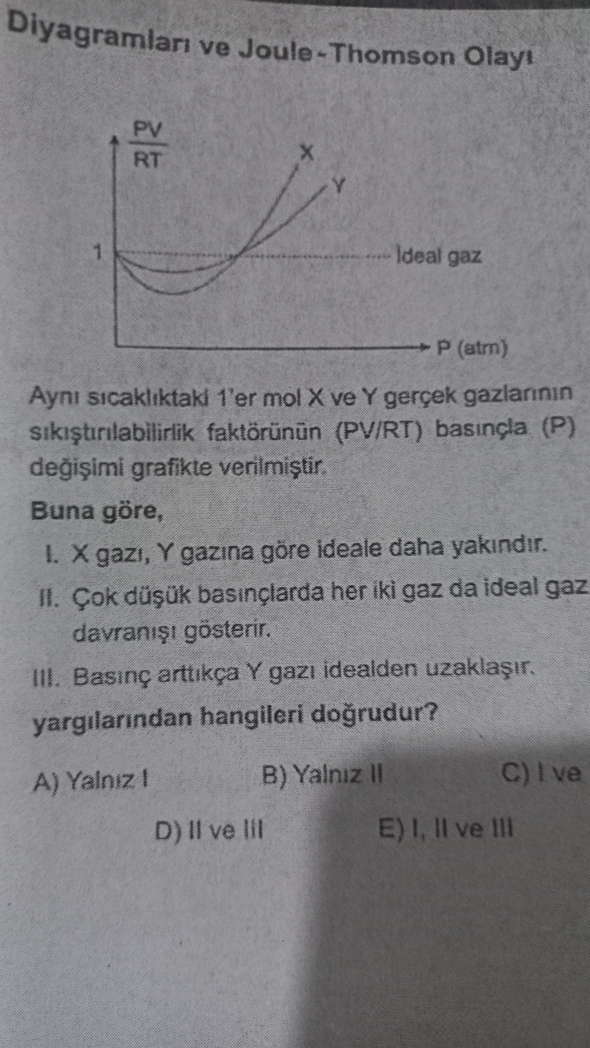 Genel açıklama: Görsel, gerçek gazlar için sıkıştırılabilirlik faktörü Z=PV/RT ile basınç P arasındaki ilişkiyi gösteren bir grafik ve bu grafiğe dayalı çoktan seçmeli bir kimya sorusunu içeriyor; ideal gazdan sapmalar ve Joule-Thomson bağlamı vurgulanıyor.