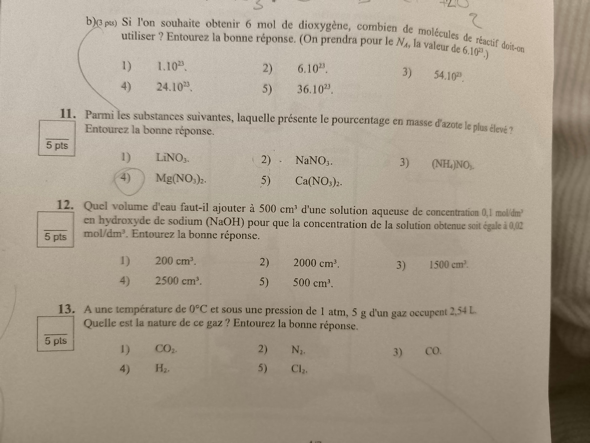 « Quel volume d’eau faut-il ajouter à 500 \, cm^3 d’une solution aqueuse de concentration 0{,}1 \, mol·dm^{-3} en hydroxyde de sodium (NaOH) pour que la concentration de la solution obtenue soit égale à 0{,}02 \, mol·dm^{-3} ? Entourez la bonne réponse. »