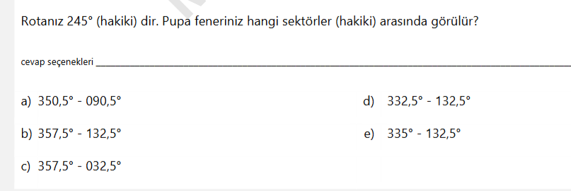 - Pupa feneri kıç yönünde merkezlenmiş 135° lik bir sektördür; verilen rota için hesap sonucu seçenek b doğru çıkar.