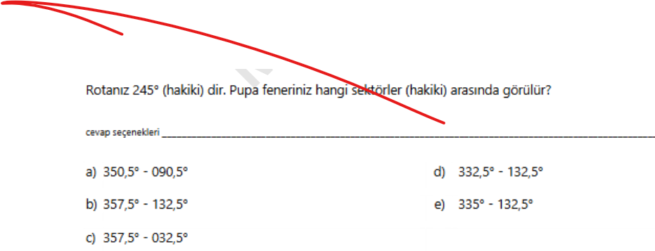 - d) ve e) başlangıç açıları (332,5° veya 335°) yanlış; pupa yönüne göre hesaplanan başlangıç 357,5° olmalı.