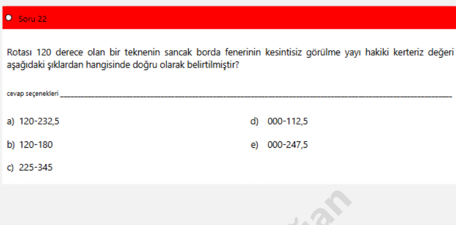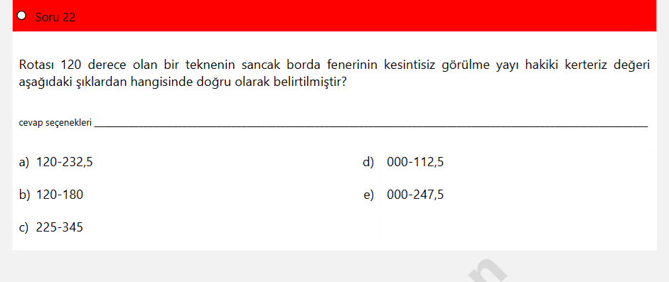 Cevap: a) 120–232,5. Çünkü sancak borda feneri rotadan itibaren sağa doğru kesintisiz 112{,}5^\circ görünür; 120^\circ + 112{,}5^\circ = 232{,}5^\circ .