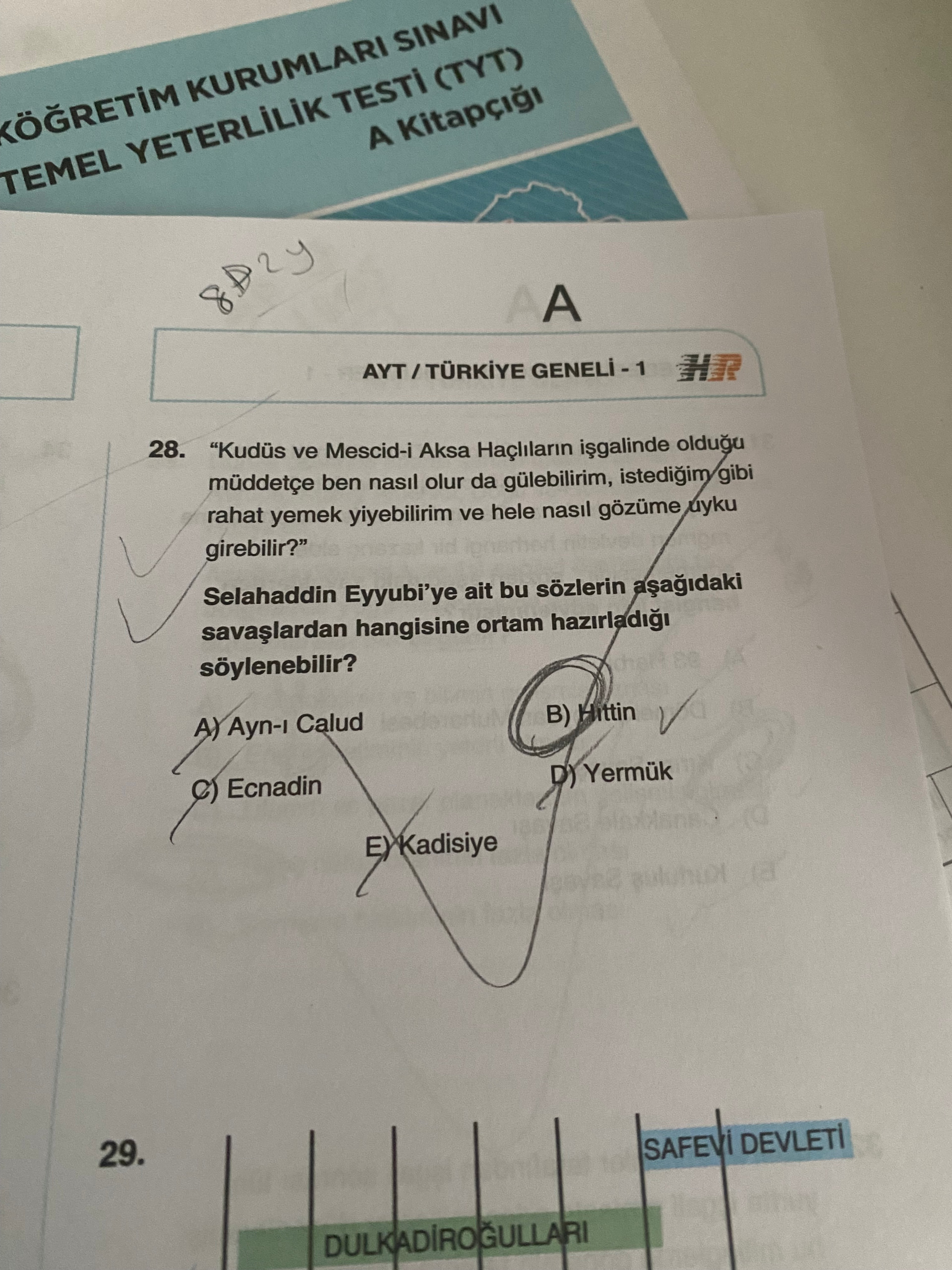 Görüntü, Türkiye’deki üniversite giriş sınavına ait bir deneme/kitapçık sayfasından bir bölüm gösteriyor. Sayfada özellikle tarih konulu bir çoktan seçmeli soru (Selahaddin Eyyubi ve Haçlılar bağlamında) ve bir sonraki soruya ait kısmi tablo/başlıklar (Dulkadiroğulları ve Safevi Devleti) yer alıyor.