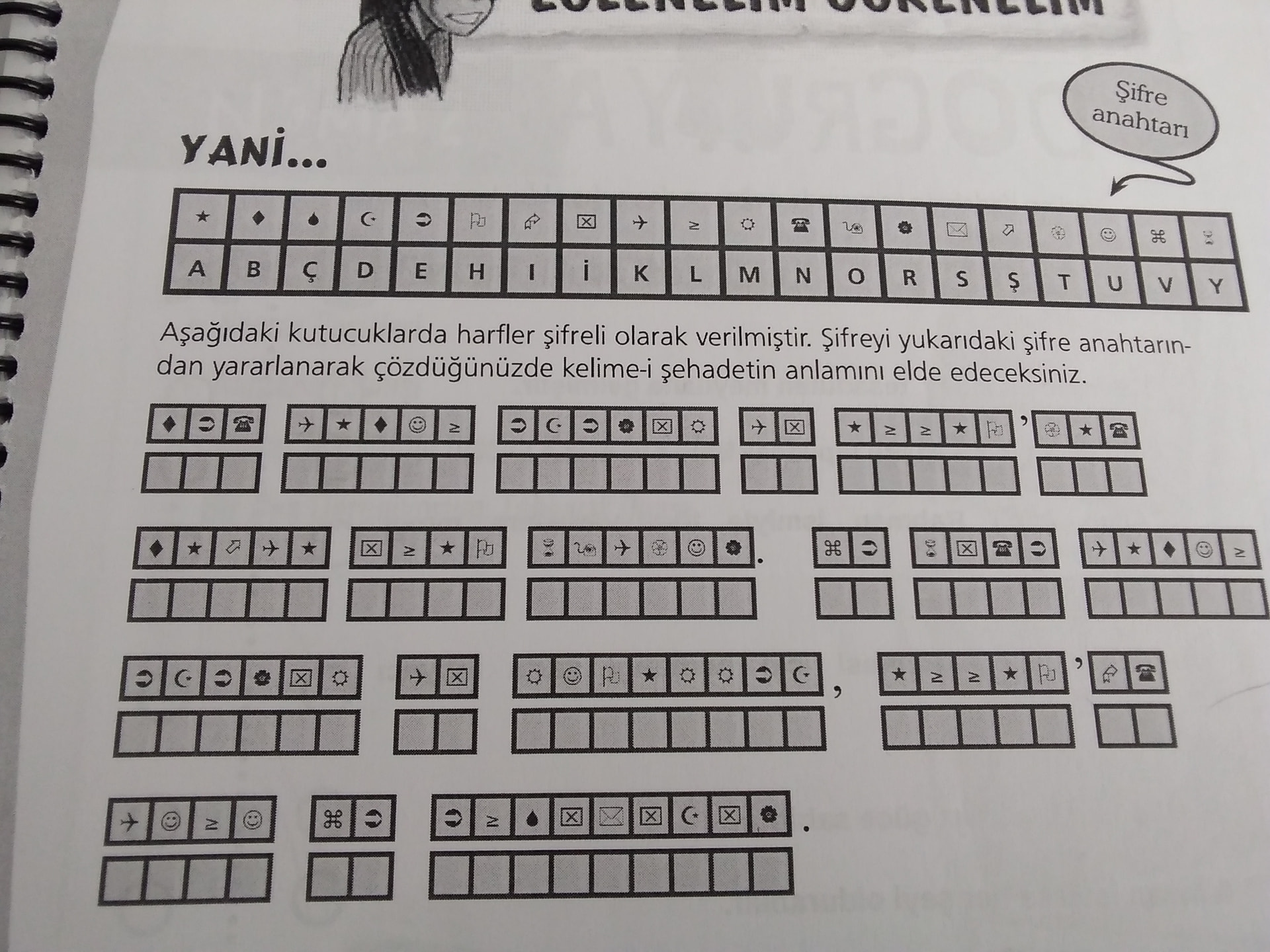 Görsel, bir “şifre anahtarı” ile sembolleri harflere çevirerek aşağıdaki kutucuklarda yazılı gizli cümleyi çözme etkinliğidir. Çözüldüğünde “kelime-i şehadet”in Türkçe anlamını veren bir şifreleme bulmacasıdır.
