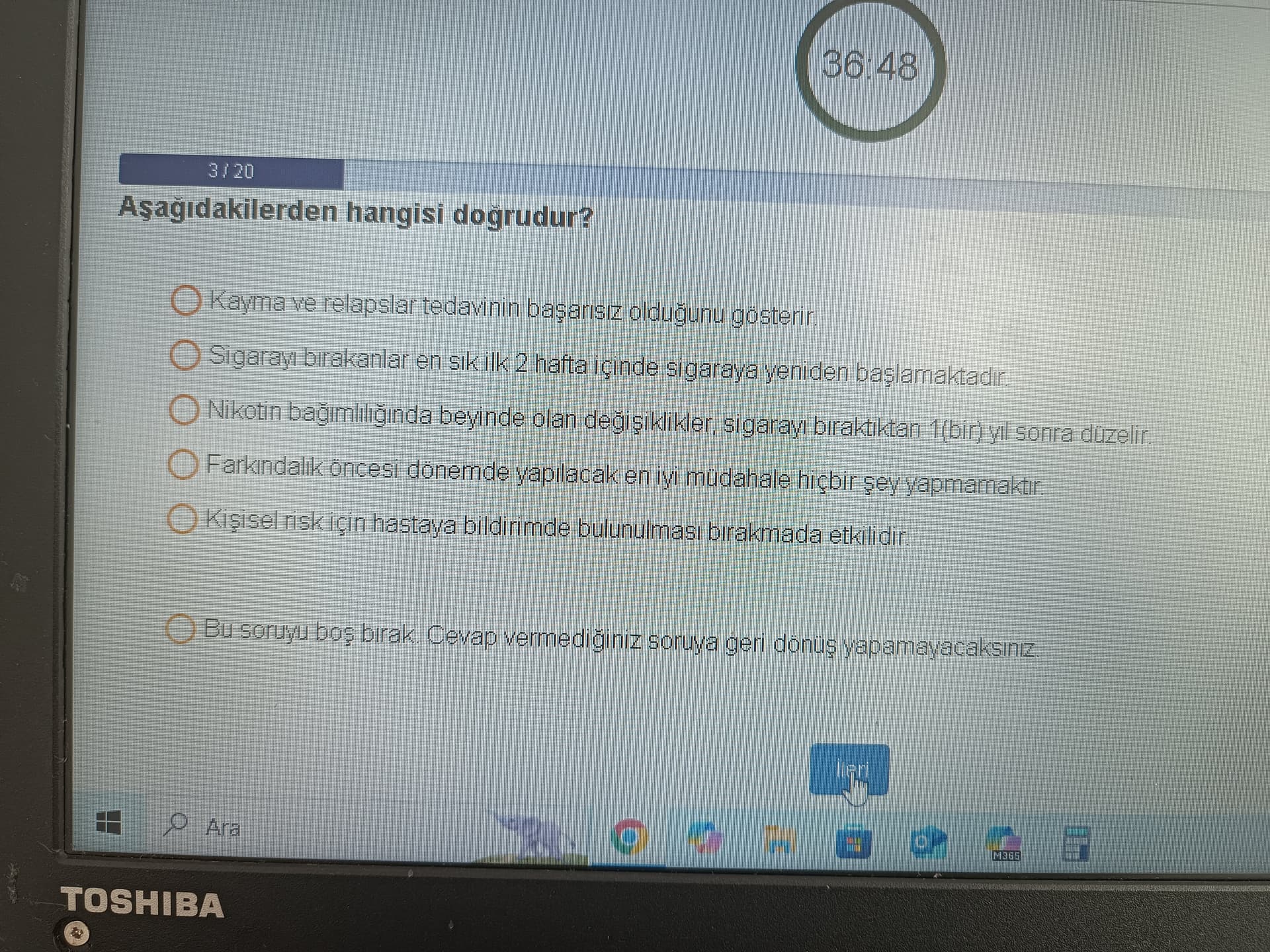 Bu görüntü, bir sınav veya bilgi testi ekranının fotoğrafıdır. Sorular sigara bırakma ve bağımlılık üzerine odaklanmıştır. Ekran, bir bilgisayar veya elektronik cihazdan alınmış bir ekran görüntüsüdür.