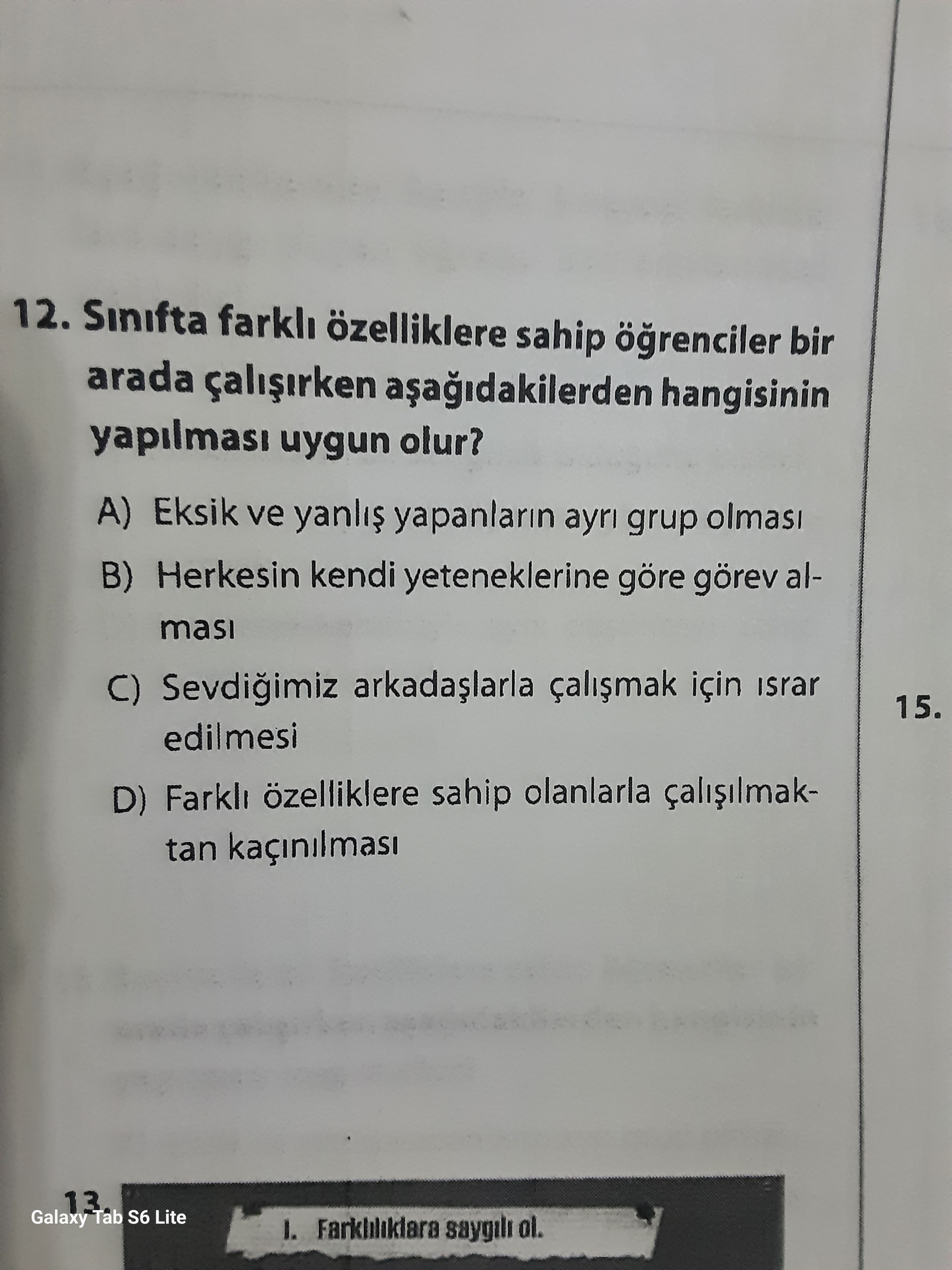 Kısa açıklama: Görsel, sınıfta farklı özelliklere sahip öğrencilerin birlikte çalışmasına yönelik doğru tutumları sorgulayan çoktan seçmeli bir ölçme sorusunu içermektedir.