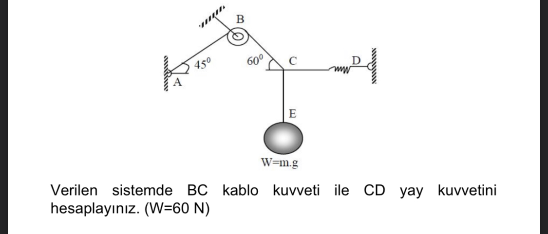 Soru: Verilen sistemde BC kablo kuvveti ile CD yay kuvvetini hesaplayınız.
