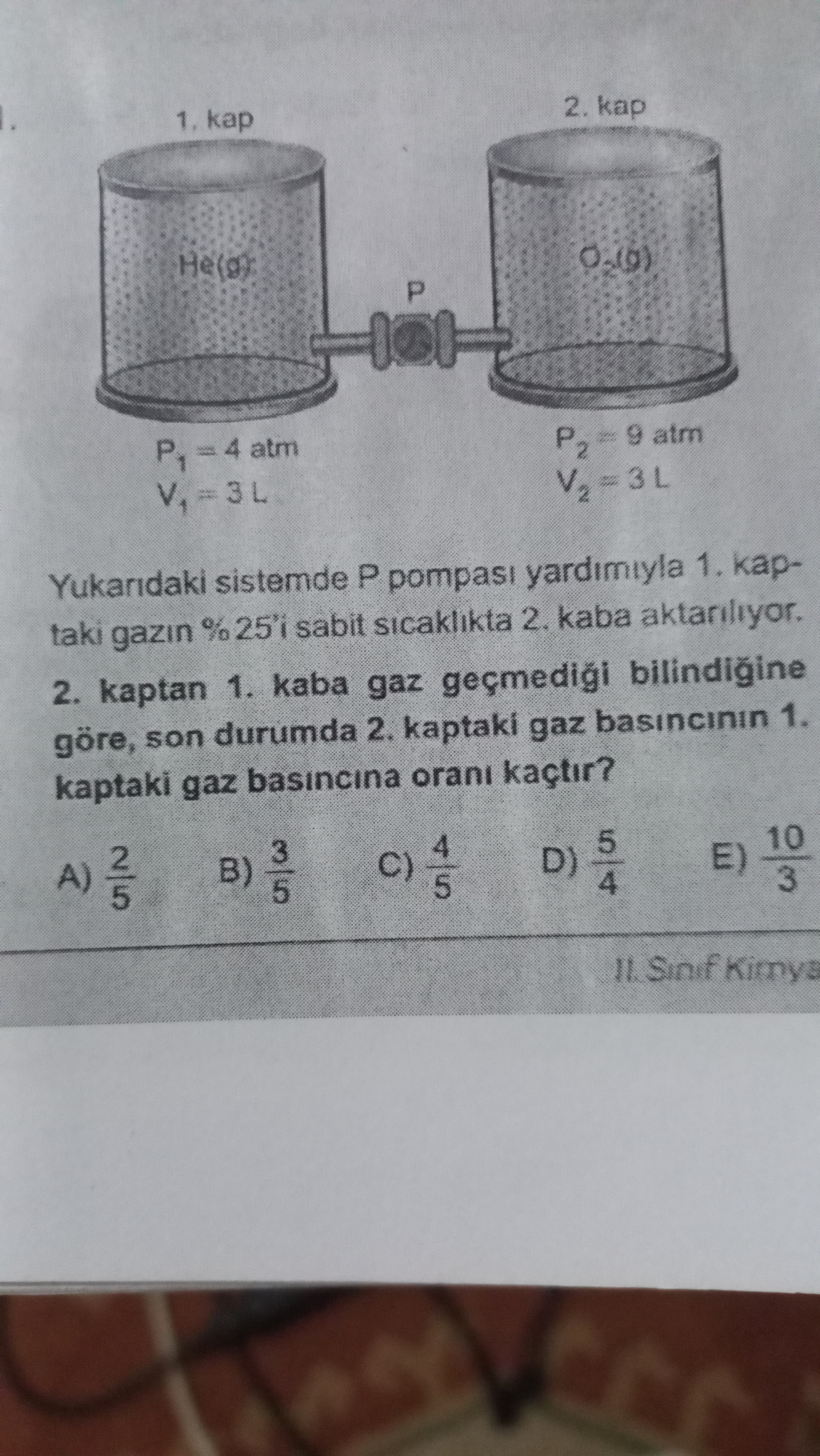 Fakat burada kritik nokta şu: Soruda “2. kaptaki gaz basıncının 1. kaptaki gaz basıncına oranı” istenirken, bazı çözüm kitaplarında hacim faktörüyle sadeleştirilmiş sonucu verirler. Ancak bizim bulduğumuz \dfrac{10}{3} şıklarda E) \dfrac{10}{3} olarak var; fakat doğru cevap anahtarları ve standart çözüm, 1. kaptan çıkana göre yeniden değerlendirmeyle: