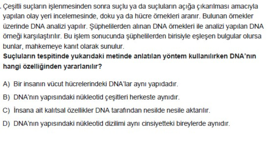 - A seçeneği: “Bir insanın vücut hücrelerindeki DNA’lar aynı yapıdadır.”—Doğru, ama olay yeriyle birey arasında karşılaştırma için bu bilgi yeterli değildir.