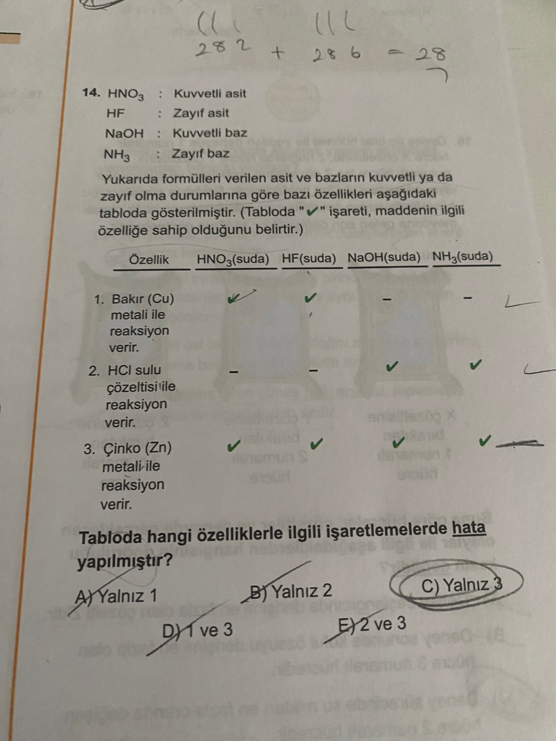 Genel açıklama: Görsel, asit ve bazların (HNO3, HF, NaOH, NH3) kuvvetli/zayıf oluşlarına göre metallerle ve HCl çözeltisiyle verdikleri tepkimeleri içeren bir çoktan seçmeli kimya sorusunu ve buna ait işaretleme tablosunu göstermektedir.